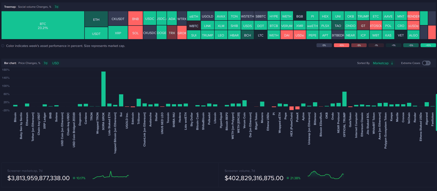 We can see how TRUMP's social volume (and price vs. BTC) skyrocketed just as this announcement was made. The meme coin surged +54% in the first hour after the announcement, and social volume clearly confirms how much this promotions has continually been on traders' radars.
