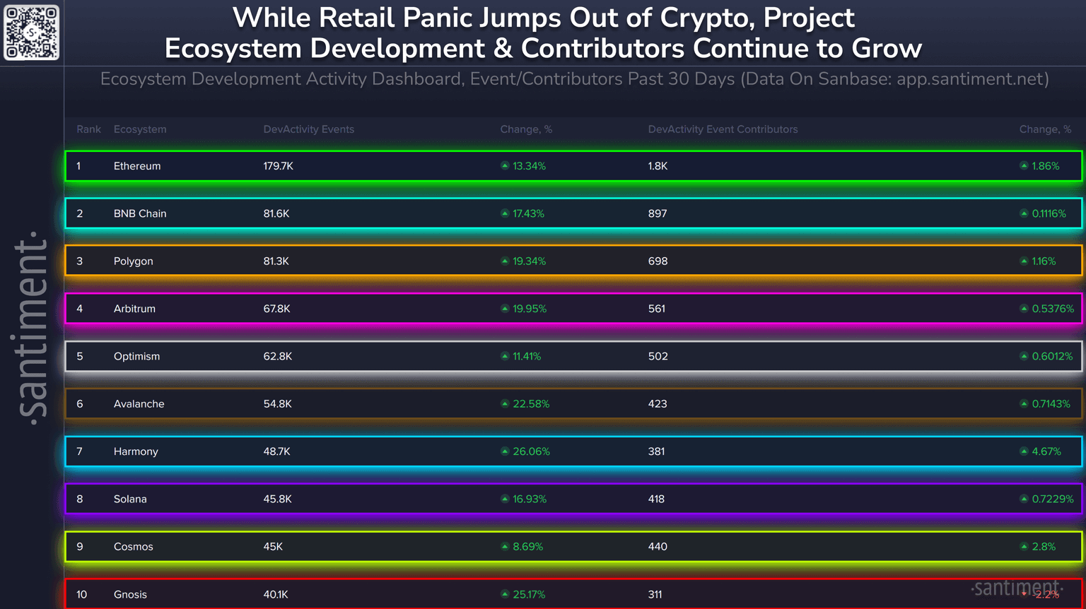 π§π» Concerned that "crypto is dead" because market caps have declined over the past 6 weeks? Here is a look at the ever-rising development activity stats among the top 10 ecosystems in cryptocurrency this past month:
