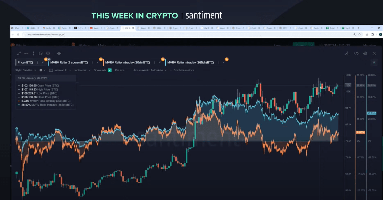 The stream concluded with a technical analysis of market conditions. Current MVRV ratios show average returns at +4.6% for 30-day and +30% for 365-day periods, indicating potential market risks. The last reliable buy signal appeared just before Trump's inauguration, suggesting careful consideration for new positions.