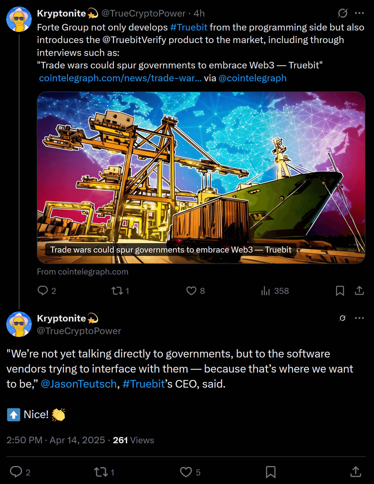The crypto ecosystem is also offering investors with a unique solution to one of the core challenges exposed by recent tariff debates: supply chain transparency. Blockchain technology can track the origin and movement of goods more reliably than traditional systems, helping customs officials verify if products were routed through lower-tariff countries. Projects like Truebit are working with government software vendors to integrate blockchain into global trade and compliance systems, highlighting crypto's growing role beyond price speculation.