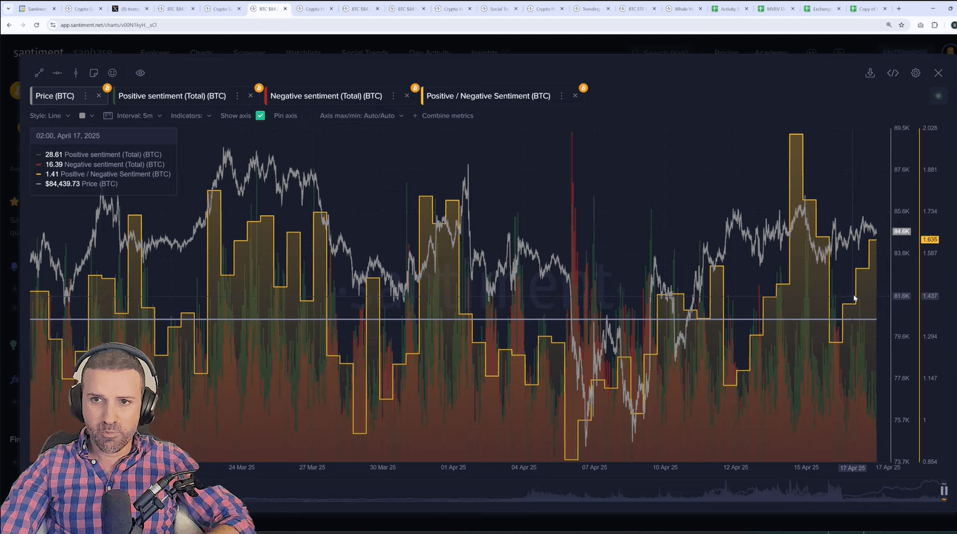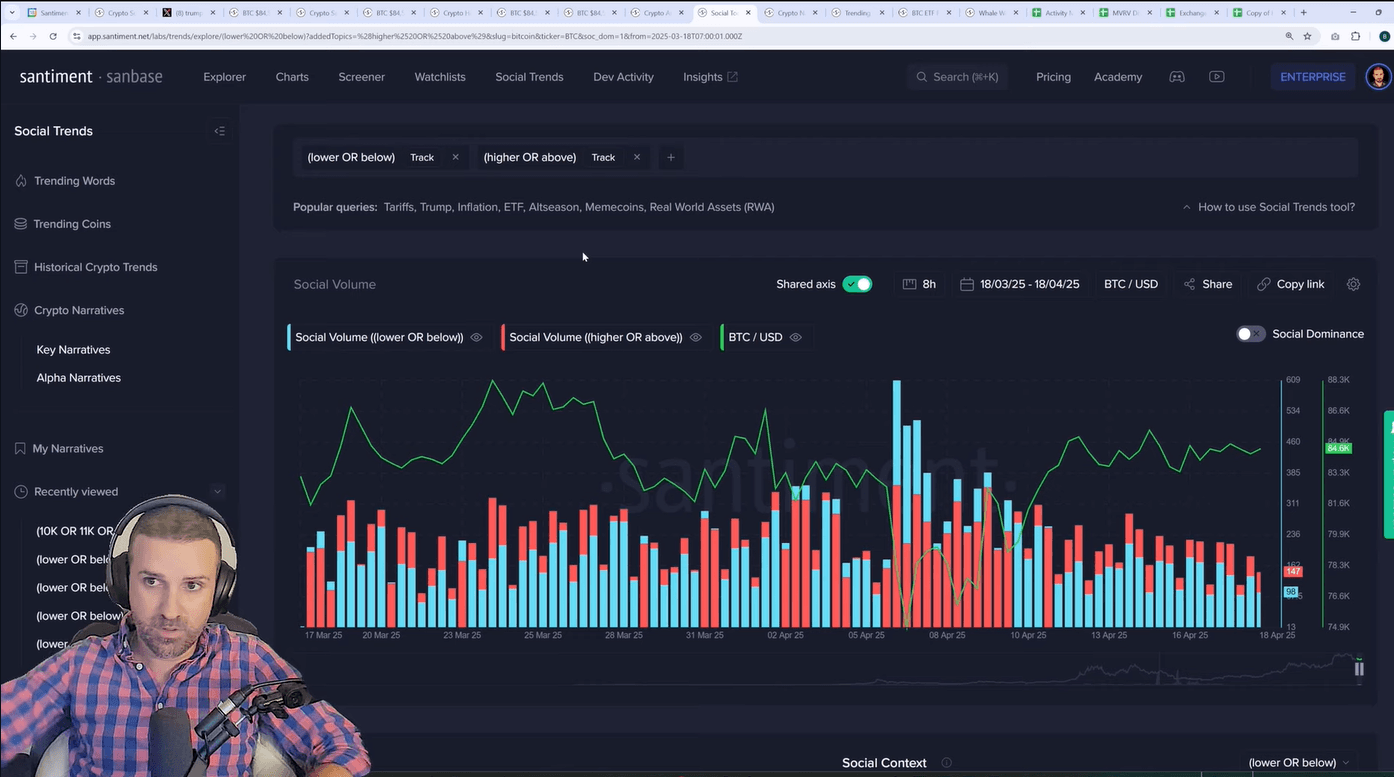 Brian showcases social trend tools to track market sentiment, noting fear spikes as buy signals. High “lower price” chatter from April 6-9 marked a perfect buying window as prices later rose.