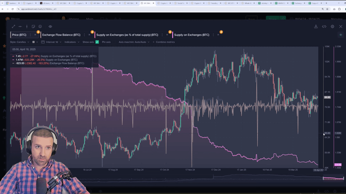 A 26.5% drop in Bitcoin on exchanges (from 2.01 million to 1.47 million BTC) signals strong hodling. Brian views this as a positive sign of investor confidence.