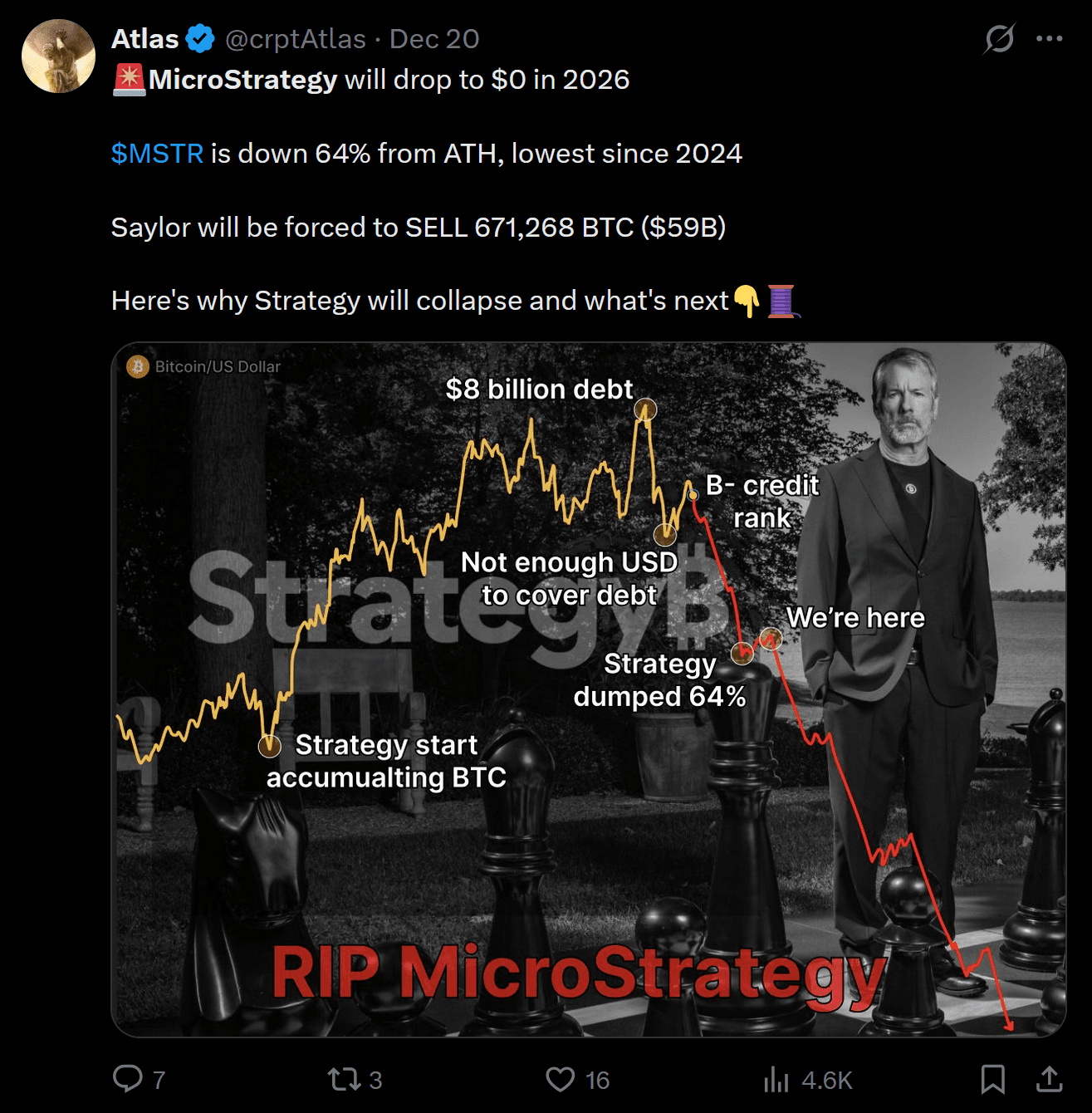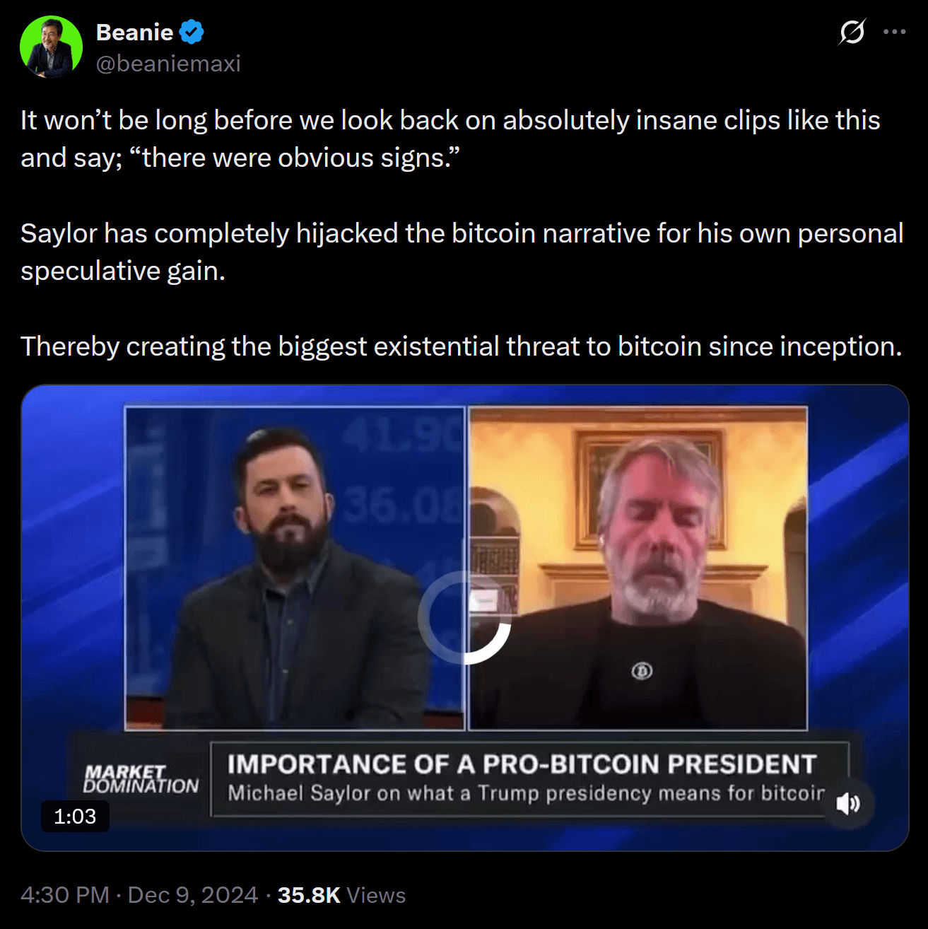 Others are motivated by financial incentives or past losses. Traders who are shorting MicroStrategy stock, or who sold Bitcoin too early, may benefit emotionally or financially if Saylor struggles. If MicroStrategy’s strategy were to fail, it would confirm their belief that heavy Bitcoin exposure is reckless. In crypto culture, being “right” matters a lot, and seeing a high-profile figure stumble can feel like validation for those who took a different path. There were even KOL's like @beaniemaxi on X who were calling this over a year ago.