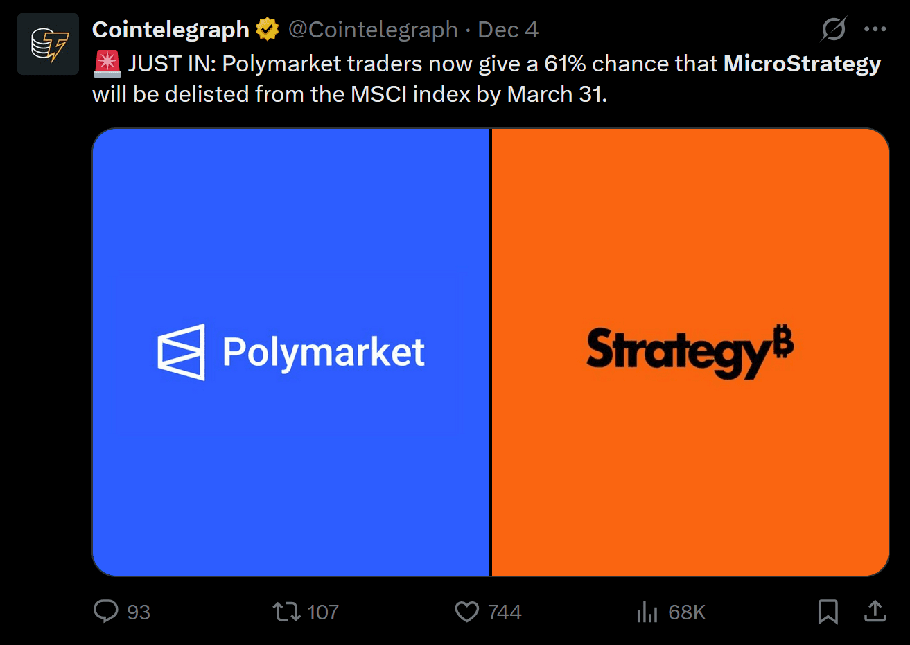 It was less than three weeks ago when Polymarket showed that 61% of traders believed that MicroStrategy would be de-listed by March 31st from the MSCI index.