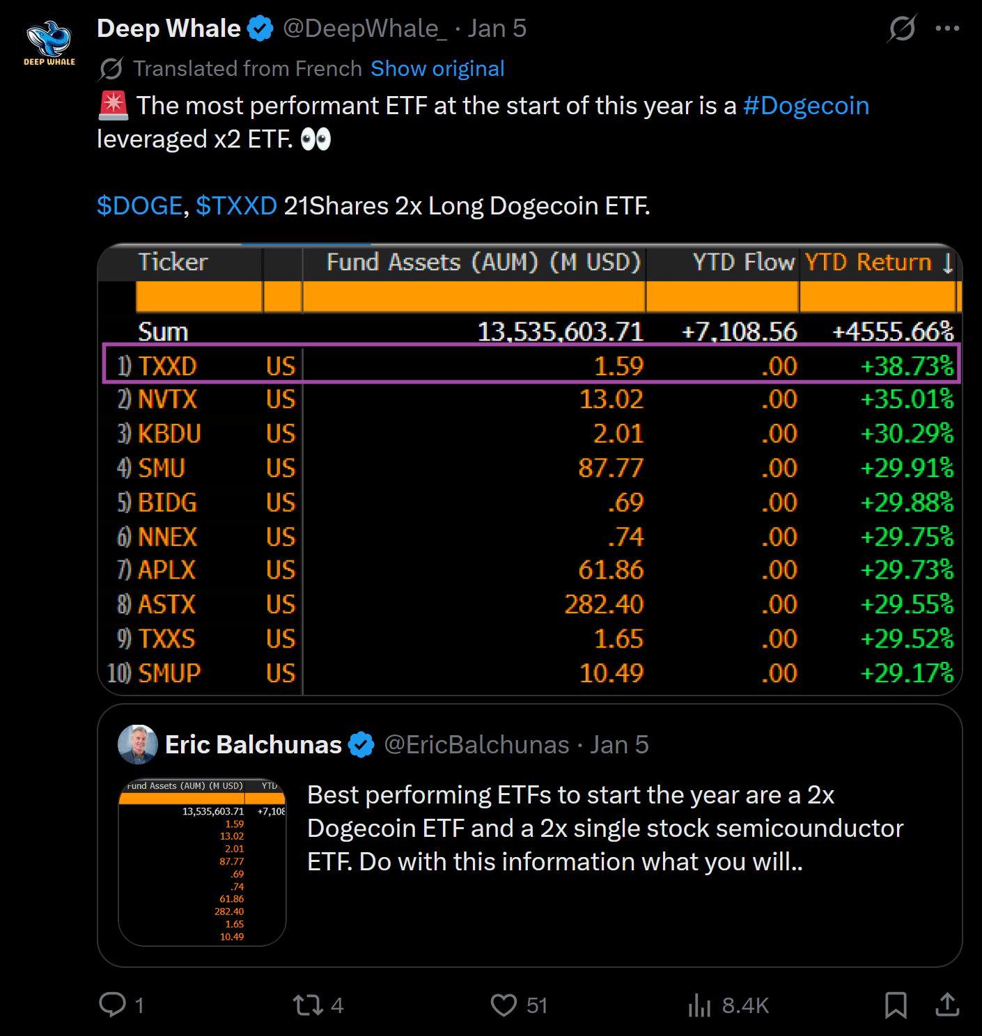 The ETF has gained attention from traders seeking high-beta exposure to meme-coin moves. Through January 8, 2026, this leveraged ETF has posted notable positive performance, generating approximately a ~38–39% in the few days of 2026 thus far. That strong showing is part of what’s put it near the top of early-2026 ETF performance lists, outpacing many other exchange-traded funds during that same period. This has had ripple effects on a moderate meme coin "boom" to start the year, as well.
