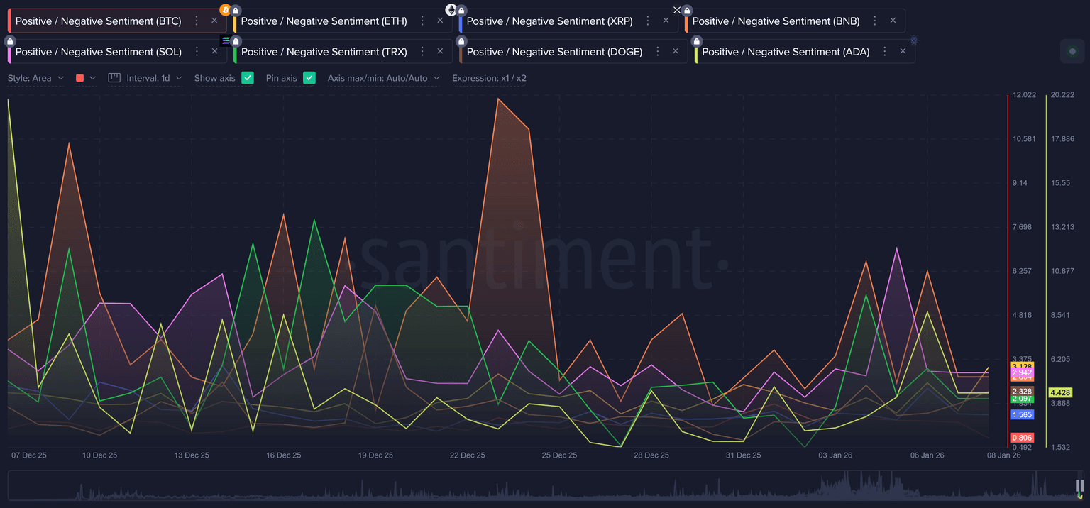 And according to the positive/negative sentiment ratio comparison chart, we've seen a few anomalies (such as Binance Coin's major retail euphoria right before Christmas or Cardano's mega bullish spike last month).