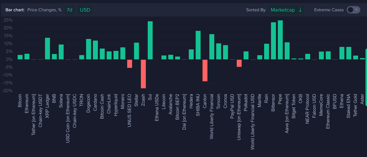 2026 has been a breath of fresh air for traders that suffered mightily ever since the correction that began after the October 6th Bitcoin all-time high. Several altcoins have gotten back on track, such as Sui. And meme coins like Dogecoin, Shiba Inu, and Pepe have also enjoyed healthy rebounds. According to Santiment's data screener, it has mostly been a sea of green for the first time in a while.