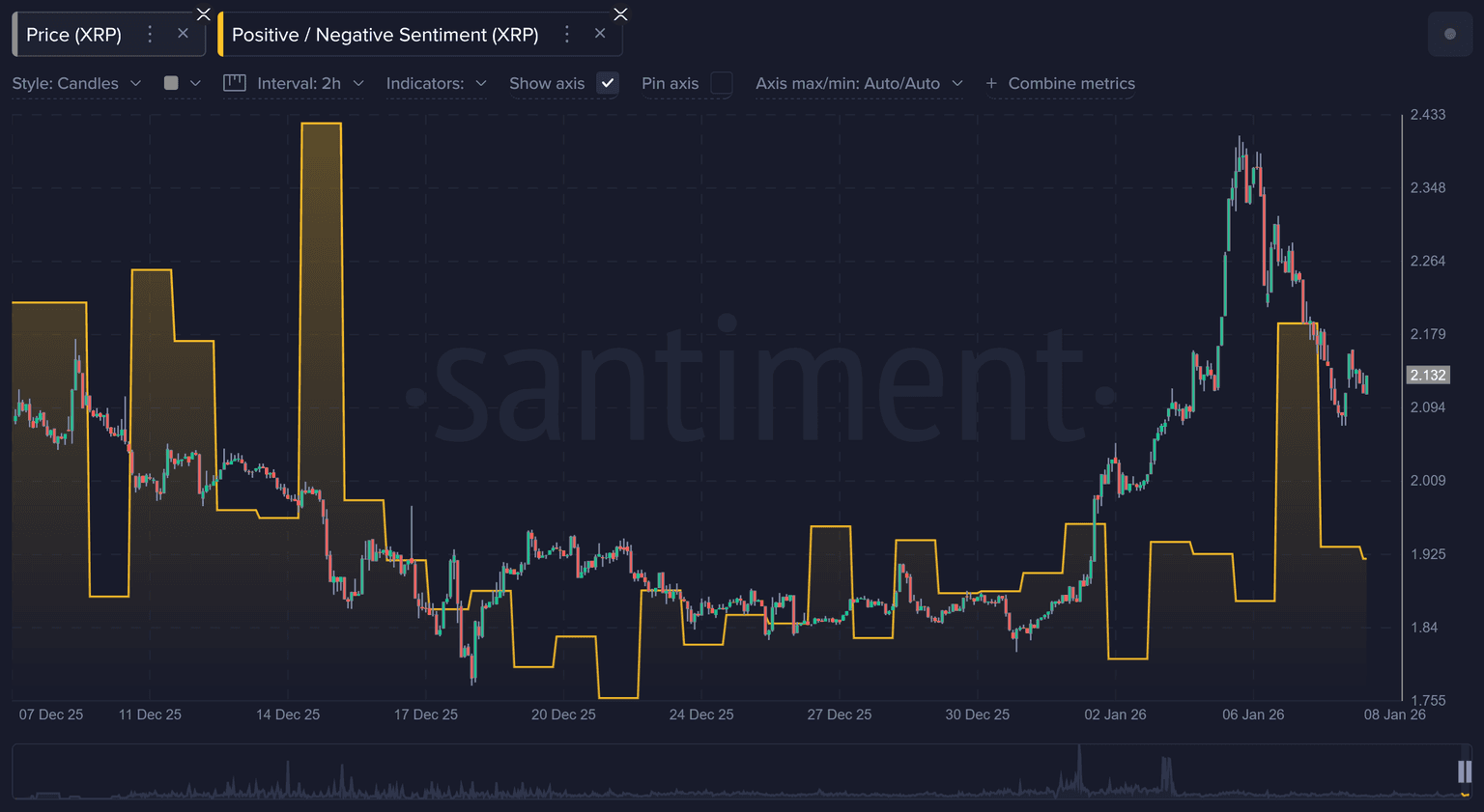 XRP started 2026 on a major surge, reaching to ~2.40 before it began to correct again over these past couple of days. Initially, there was quite a bit of crowd disbelief toward the rally. But when small traders saw a dip buy opportunity, we can see where there was a sudden surge of positive sentiment as they tried to "time the bottom". As usual, the crowd consensus was incorrect, and the asset has bled a bit more since. Expect that FUD becomes prevalent if XRP starts to test $2.00 once again.