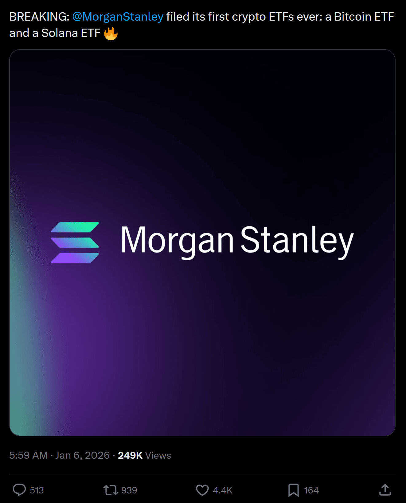Solana’s biggest clear-cut January 2026 headline has been institutional product momentum. On January 6, 2026, Reuters reported that Morgan Stanley filed with the SEC for ETFs tied to bitcoin and solana, a notable step because it signals a major bank pushing further into “spot-style” crypto exposure beyond the usual asset-manager crowd.
