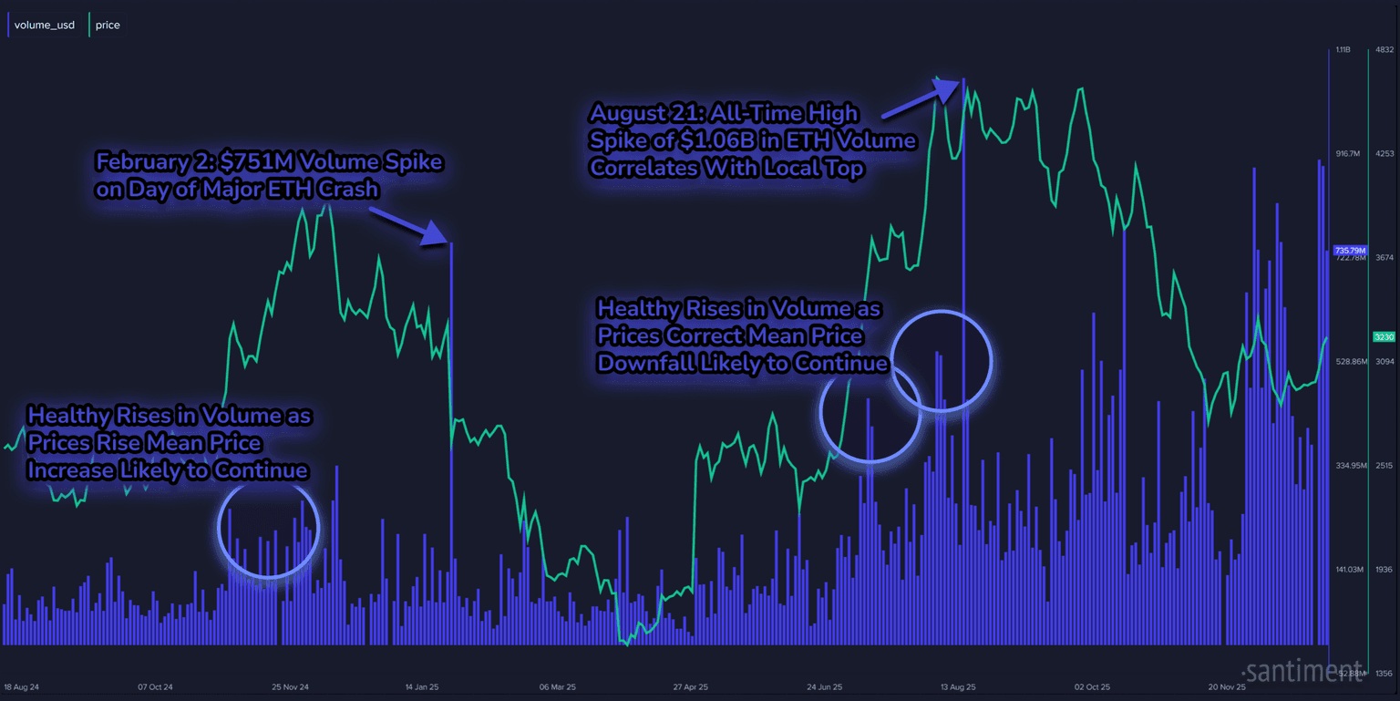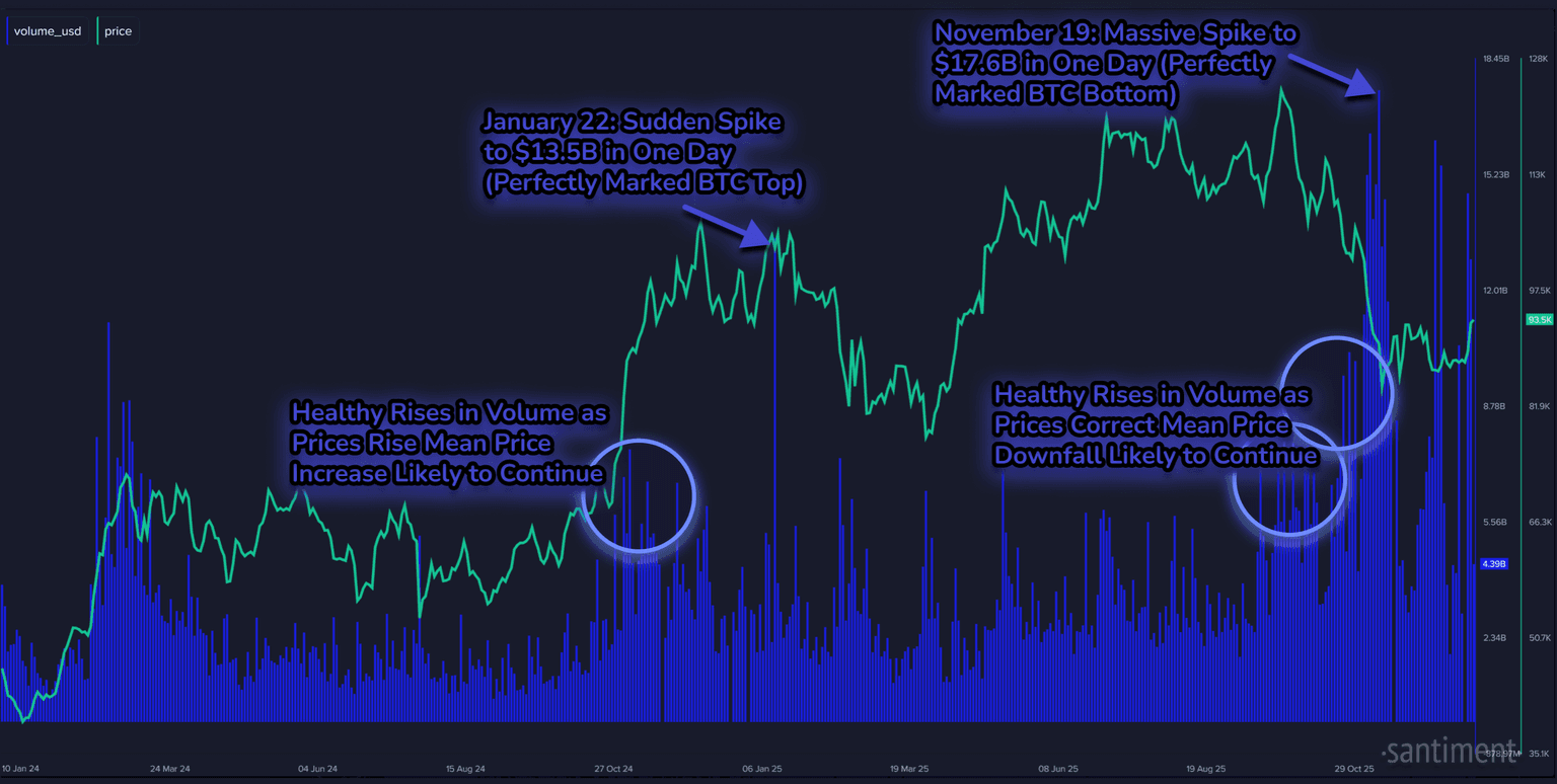 And similarly, we saw healthy volume rises leading up to the November 19, 2025 major spike of $17.6B in volume. This was an example of the healthy volume supporting the continuation of a price drop, followed by the big spike ending the cycle (and starting a price rise).