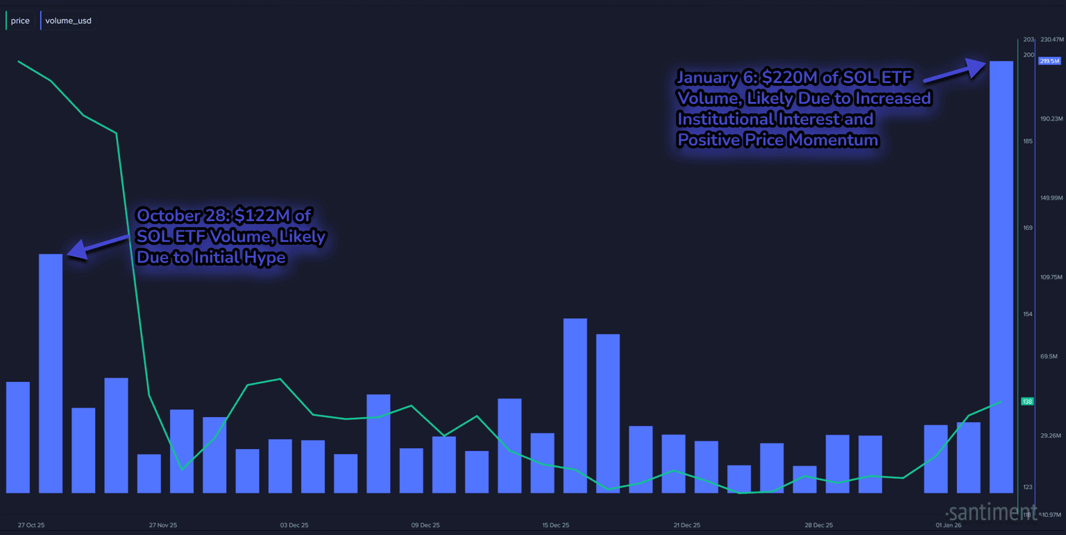 For brand-new ETF's like Solana’s, large volume swings can carry more meaning than they would for older, more established products. With only a short trading history, each surge in volume helps shape how the market values and uses them. Early spikes often come from launch excitement (just like we saw for Bitcoin & Ethereum), but later record-breaking days suggest something more deliberate. When volume expands as price moves higher, it points to stronger participation rather than thin trading, which can help reduce volatility over time. In this early stage, rising volume may be a sign that the ETF is gaining credibility, liquidity, and repeat buyers instead of being driven purely by short-term speculation. As mentioned, however, this small sample means it's difficult to decipher whether today's $220M spike IS the anomaly... or if it's just the start of rising volume that could be the new normal for crypto's #6 ranked market cap.