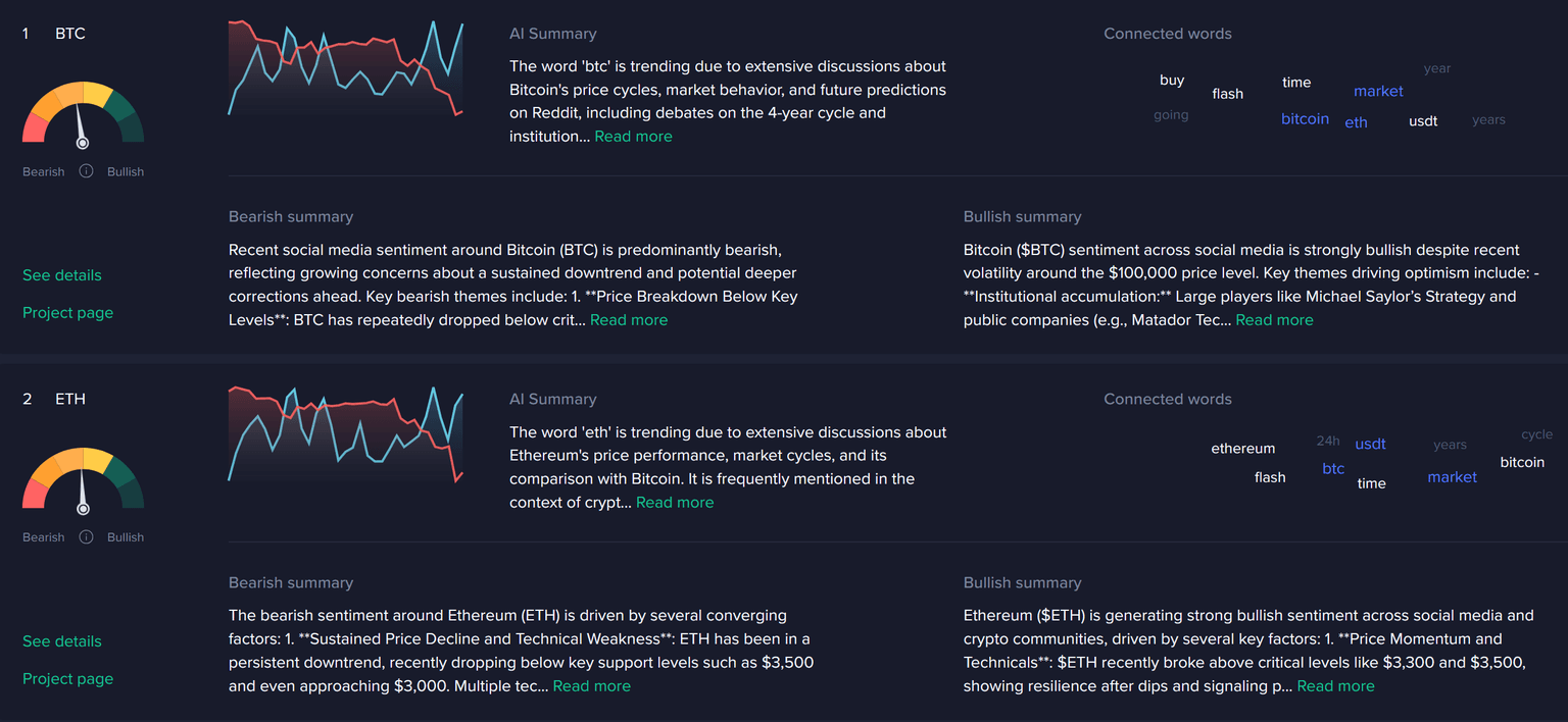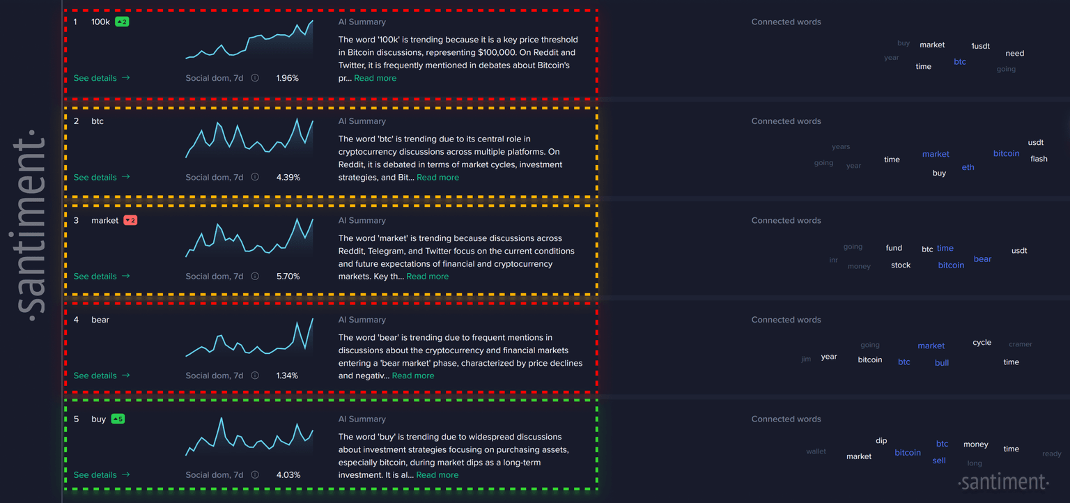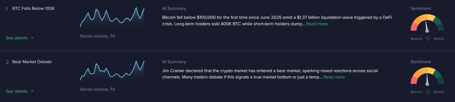 Similarly, we can see the Top Trending Stories Dashboard highlighting the top two bearish keywords (above) in further detail. As the top two stories our algorithm sees an influx of conversations on, Bitcoin's fall below $100K and the bear market debate signal obvious connections between the coin falling below this support level, and crypto entering a bear market.