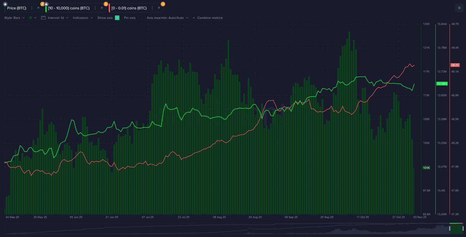 With all of this analysis about how retail is reacting to crypto's strong retrace, don't forget to keep an eye on how they are accumulating or dumping their coins. The red line below represents the total coins held by wallets with 0.01 or less BTC. Since the all-time high 4 weeks ago, retail has been aggressively accumulating with the expectation that any dip is an opportunity to buy more.