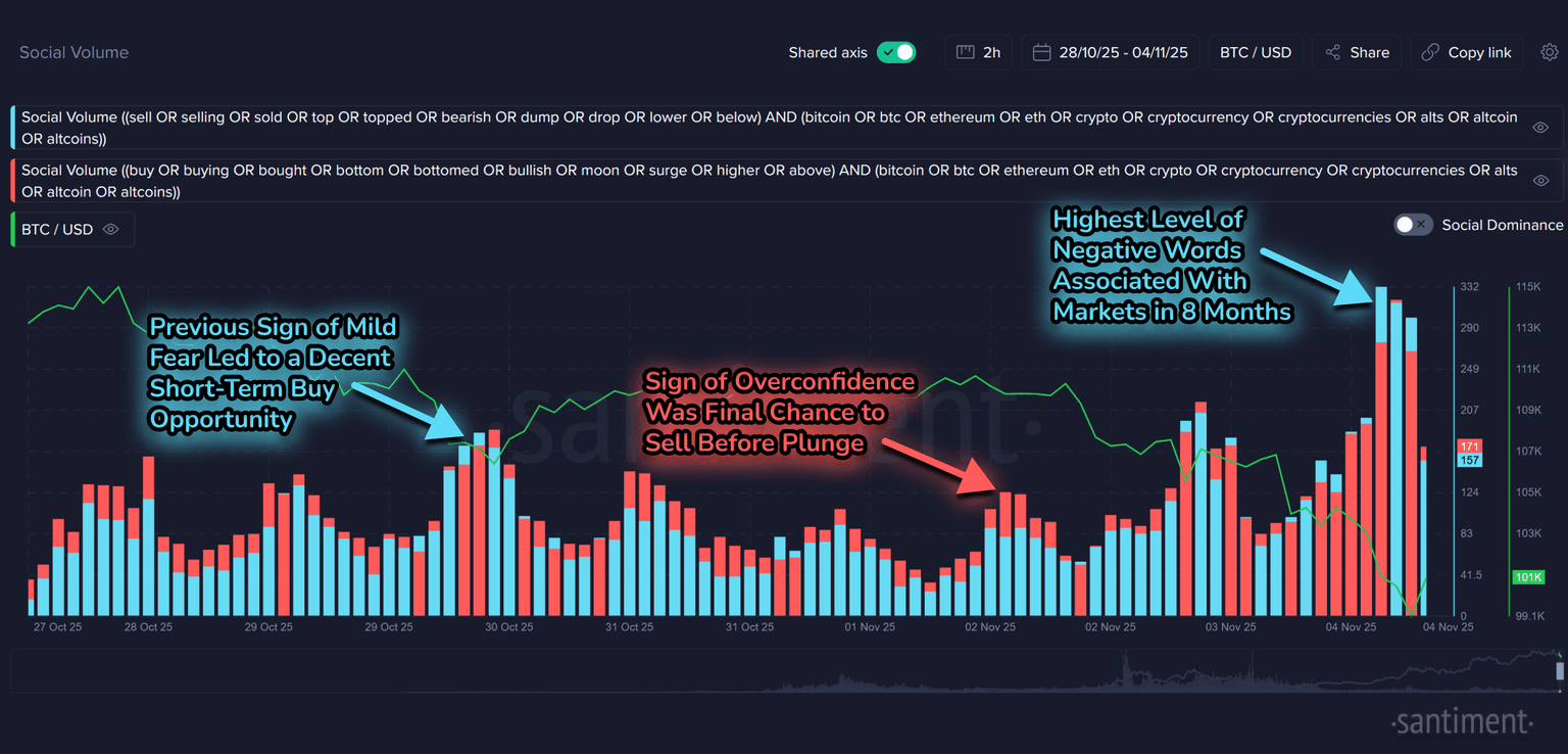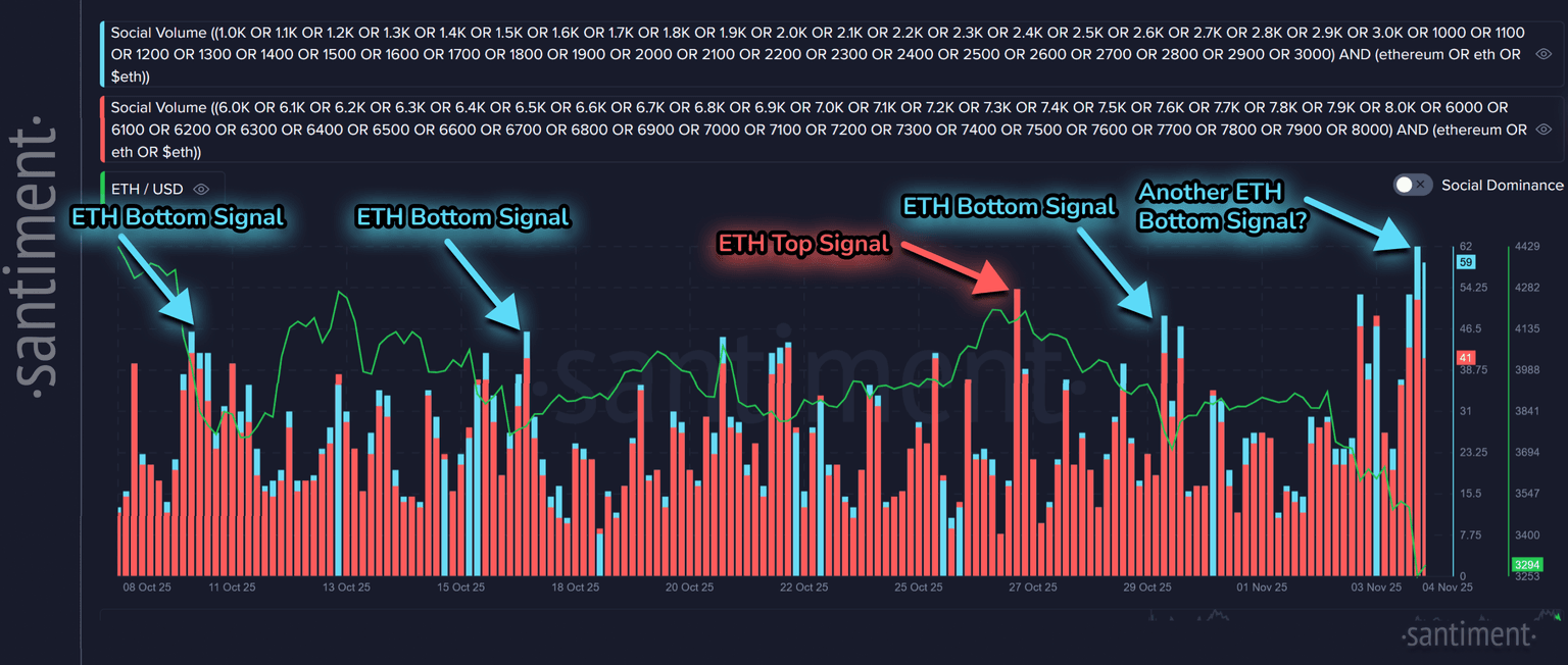 Ethereum's ratio of positive vs. negative comments is even more extreme, with today being the 2nd most bearish day in the past 6 months. Only the flash crash back on October 10th, when Trump temporarily threatened 100% tariffs on China, saw a higher level of bearish vs. bullish comments. FUD spikes have been relatively reliable signs of bottoms for ETH, just like it has been for BTC.