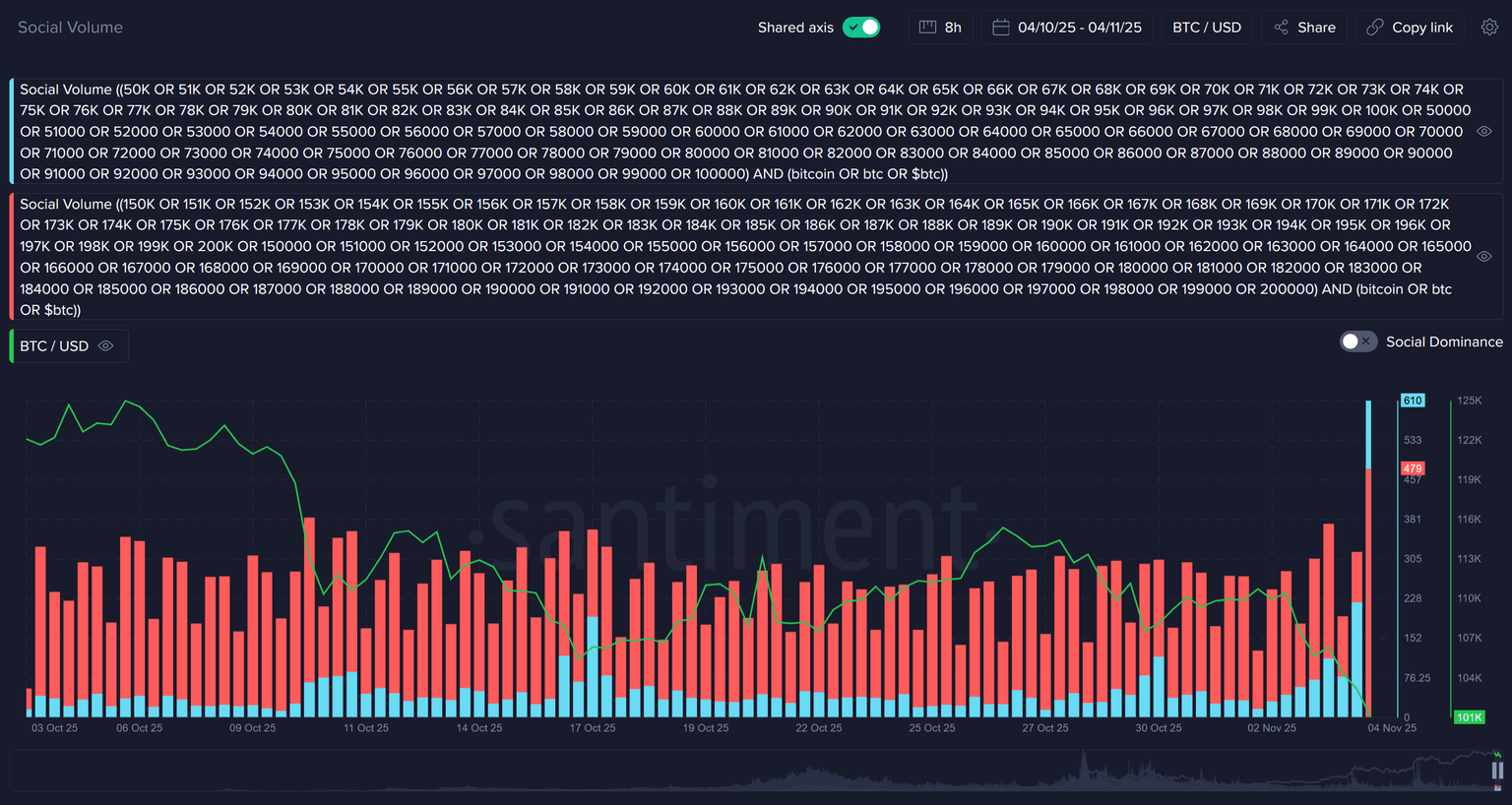 Now that Bitcoin has officially breached one of the zones on our highly popular 100K vs. 200K, some adjustments will need to be made in order to accurately measure when the crowd is getting greedy or fearful. Generally, when the crowd calls for prices well above BTC's price, it's a sign they are having too much FOMO and prices go down afterward. And when they call for price well below BTC's prices, it's a sign of FUD and prices go up afterward. We'll have some updates on the parameters of this chart soon, but take a look at what happened Tuesday in the blue "100K" mentions once it was clear that $100K had been breached: