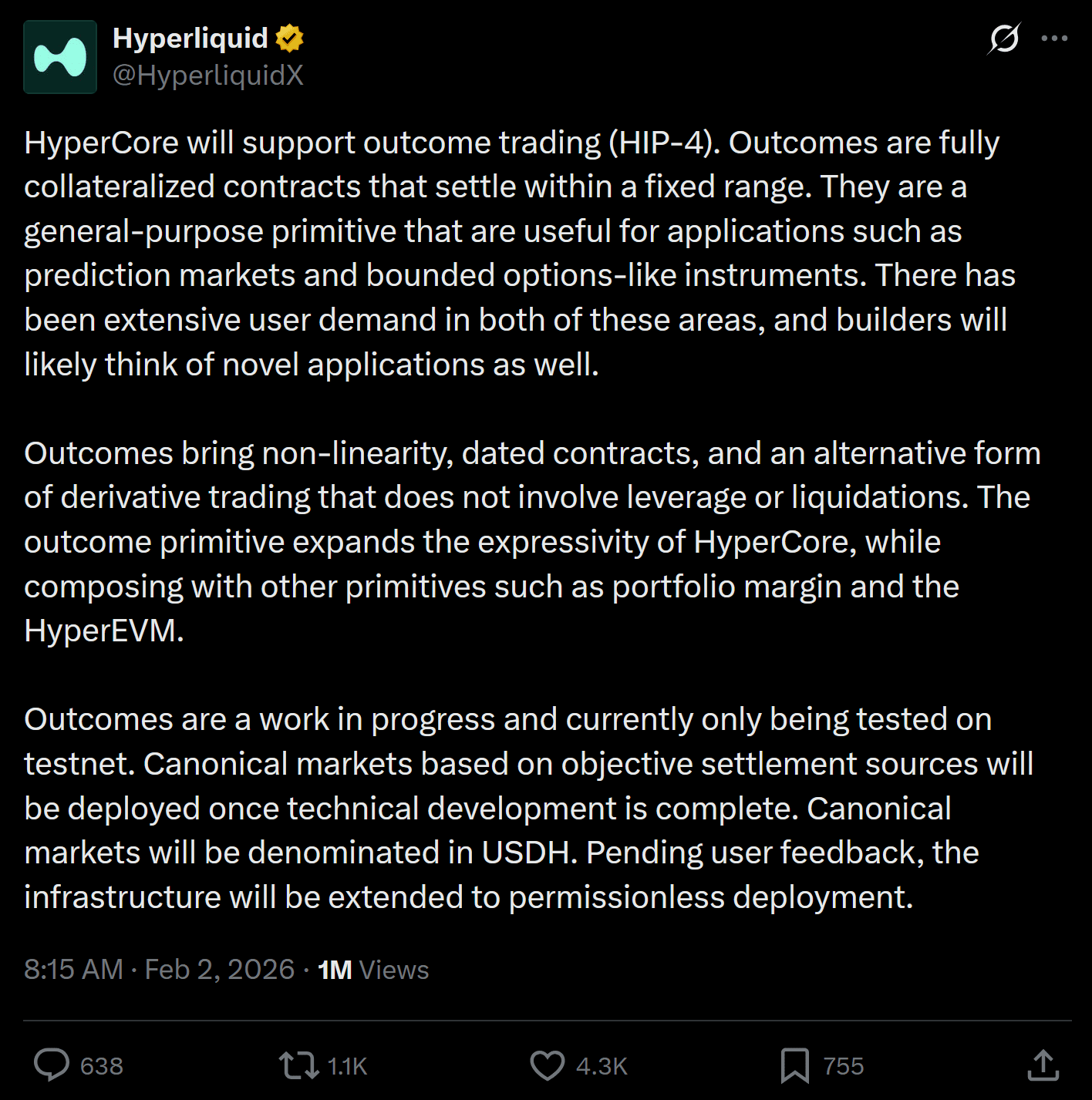 While technical upgrades alone don’t guarantee success, the combination of expanded derivatives tools and a clear positive price reaction suggests that many in the community view HIP-4 as a meaningful step forward. Whether this translates to sustainable usage and deeper liquidity over time will depend on how soon outcome markets go live on mainnet and how actively traders use them for hedging, speculation, or structured strategies.