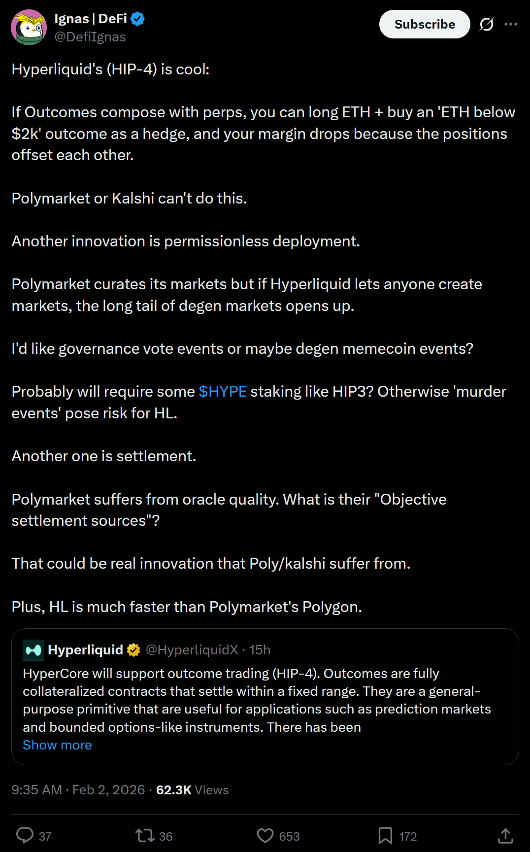 Discussion around HIP-4 has also included comparisons to existing prediction platforms like Polymarket. One widely shared analysis from a market commentator estimated that even if Hyperliquid captured 100% of Polymarket’s current volume, the added revenue would represent only about 5% of Hyperliquid’s total business. The point of the comparison wasn’t to downplay HIP-4, but to highlight the scale of Hyperliquid’s existing perpetual markets. In other words, prediction markets are being viewed as a strategic extension of an already large trading engine, rather than the primary revenue driver for the time being.