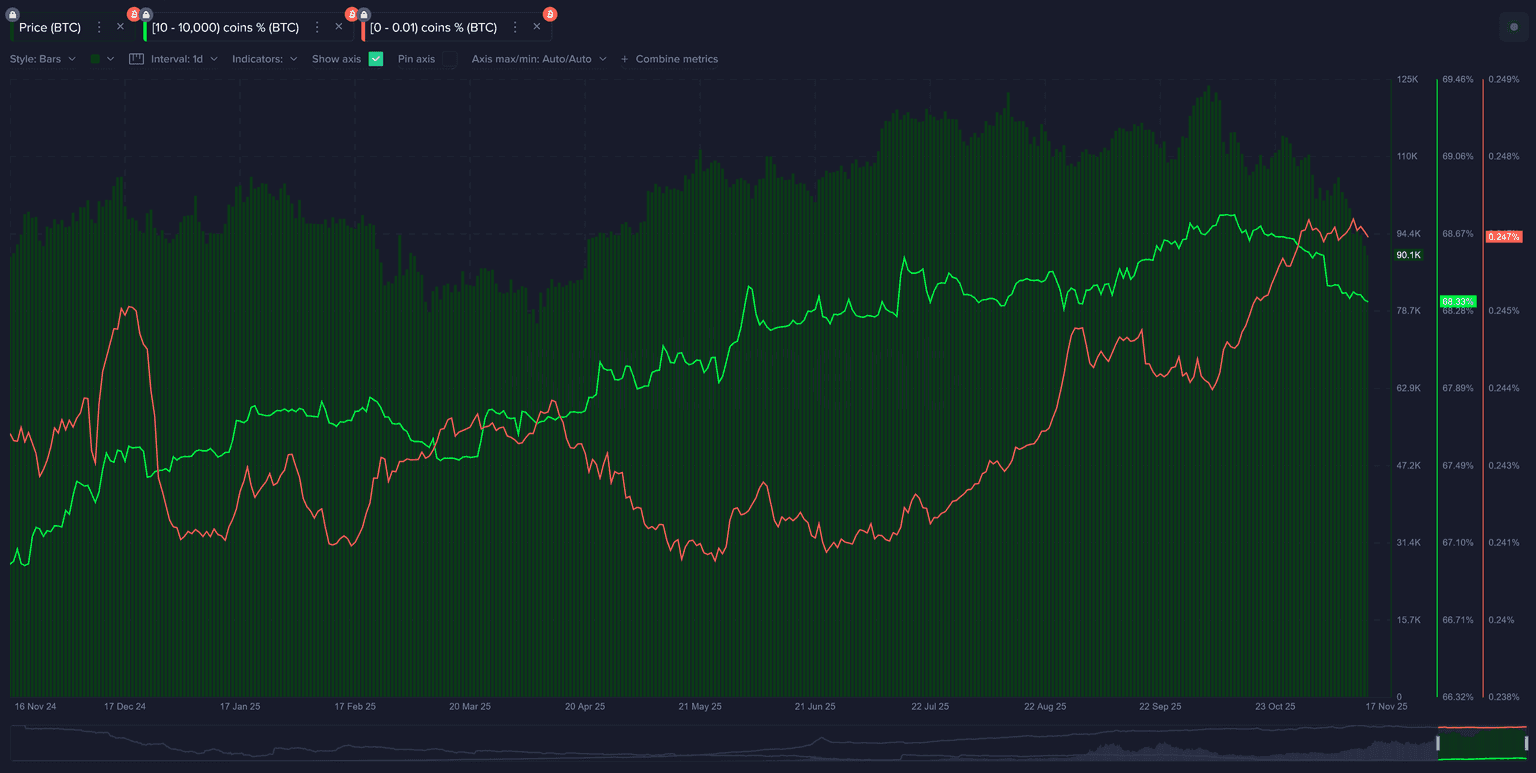 As we can see, traders were predicting even higher prices (125.8K all-time high on October 6th. But things have gradually switched to where we are - dominant predictions of $80K and below. Though we haven't seen prices that low since 2024, traders certainly aren't being shy about discussing how low things can go now that we've freefallen the way we have. Generally, this is a good thing to see so many bearish traders and predictors out there, even if retail's overall holdings haven't really changed much.