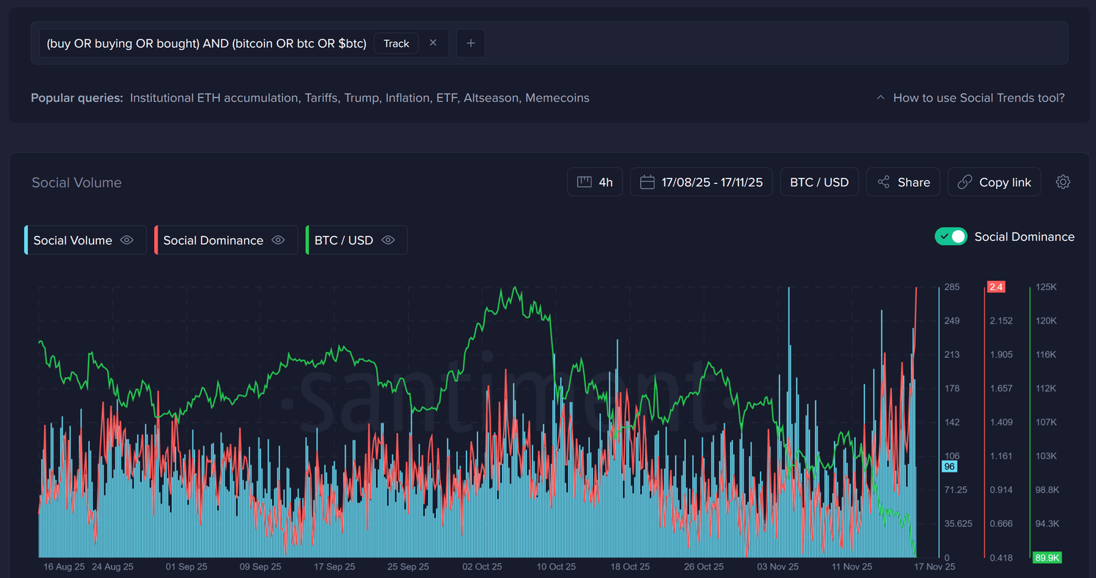 And what about mentions of buying Bitcoin's dip? During the 4-hour interval at the time of this writing, social media is discussing this topic at the highest frequency since the first week of March, an 8-month high.