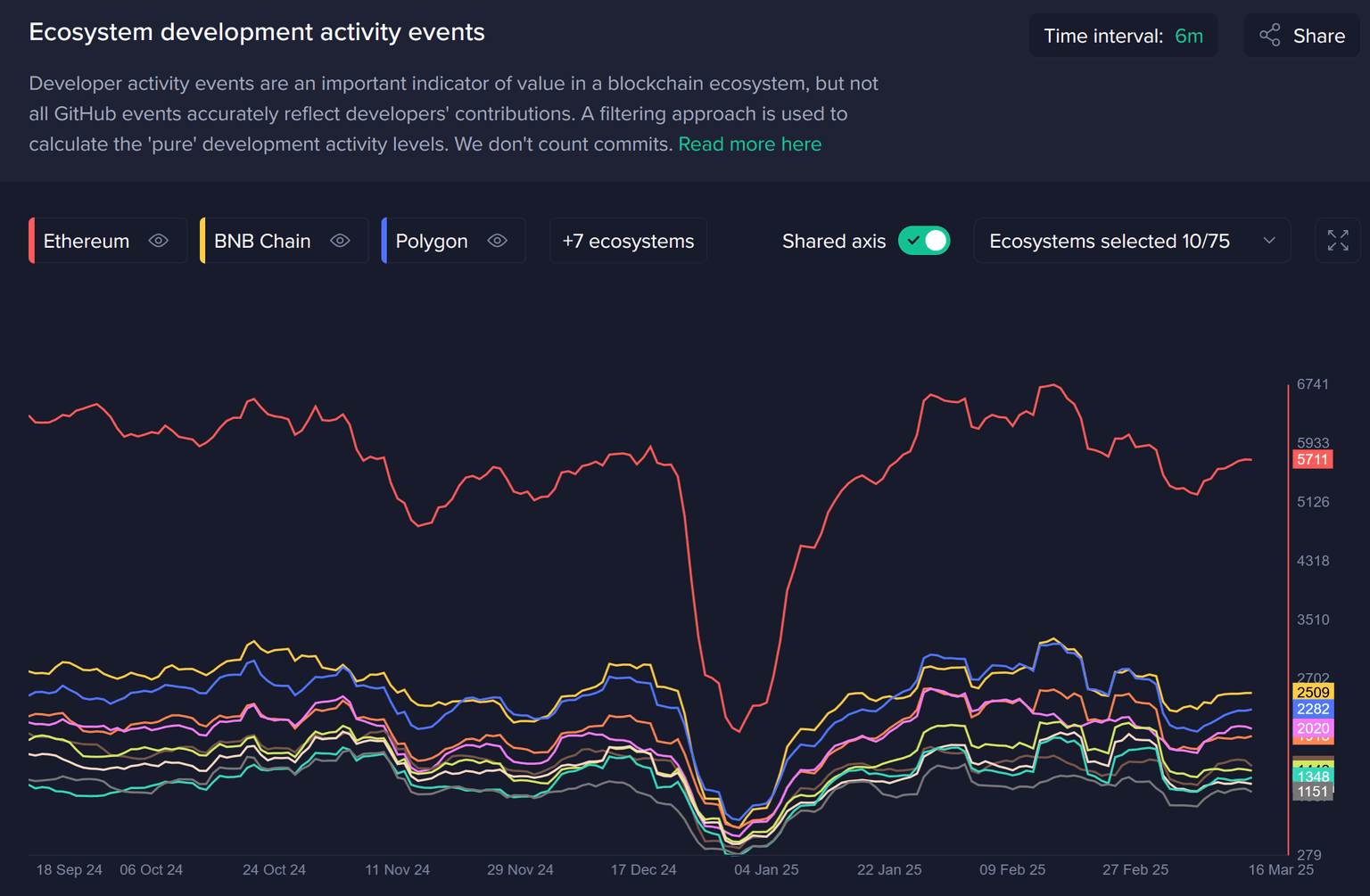 With this dashboard, we can see trends of different ecosystems, directly comparing their development rates against one another. Often times, we may see one generating a bigger and bigger lead thanks to just a few assets. It's no surprise to see Ethereum's ecosystem continuing to lead by a wide margin.