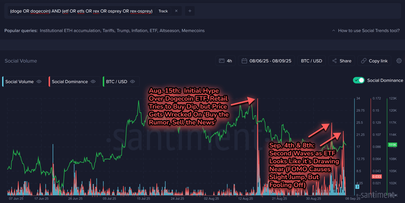 There was a clear moment of face-palming from the crowd that tried to get in early on the initial news of this likely approved DOGE ETF. This group essentially bought at the local top on August 15th, but rumors essentially fizzled out until these past few days (three weeks after the hype). And with an estimated 93% likelihood of approval, the FOMO has been met with some mild price climbs this time around. But as we've learned from previous hype around ETF's, the extent of its rally will likely go only as far as its actual impact can take it. DOGE FOMO, in many previous instances, has often been one of the primary examples of selling when the crowd is buying.