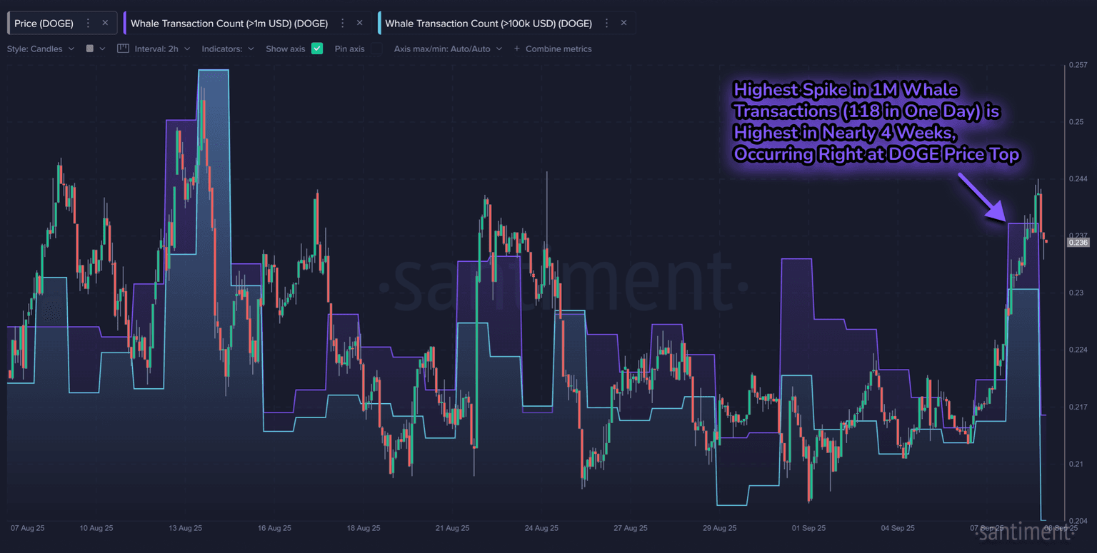 We can see how DOGE whale transactions initially drove prices down, very likely indicative of profit taking on the initial ETF rumors in mid-August. At the turn of the month into September, these whales began to become active again (accumulation near the bottom). And yesterday, once again, it appears that they took profit right before the mini Dogecoin price rally cooled off again.