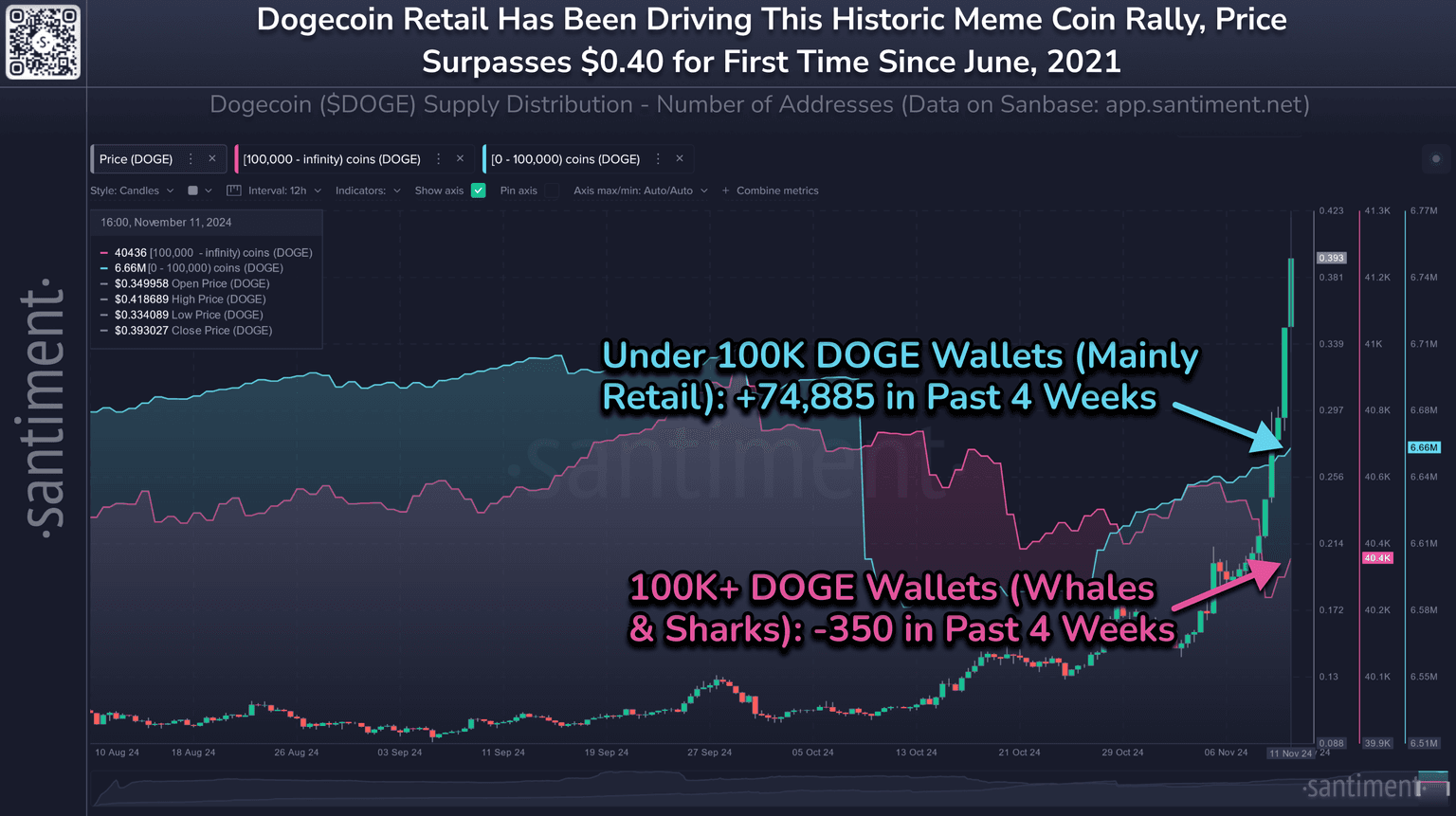 Meanwhile, shark and whale wallets are declining during this time, with a net drop of -350 in this same timeframe. Though 108 have returned in the past couple days to help spark this latest rally over $0.40 for the first in three and a half years.