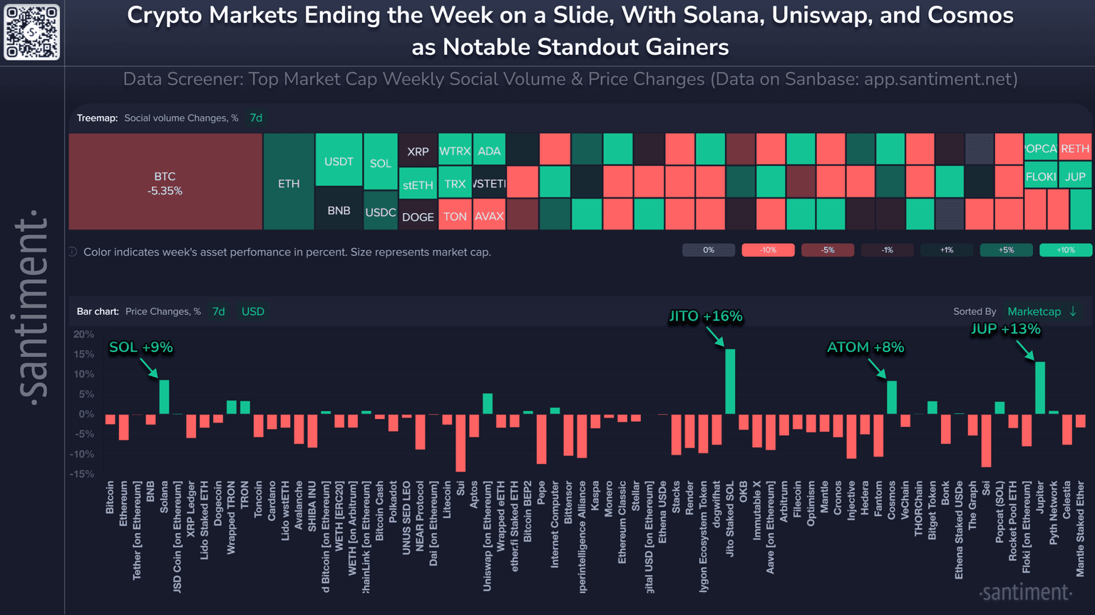 π Solana, Jito, Cosmos, and Jupiter have been the notable standouts during a tumutuous up and down week for crypto markets. Data indicates meme coins have draw