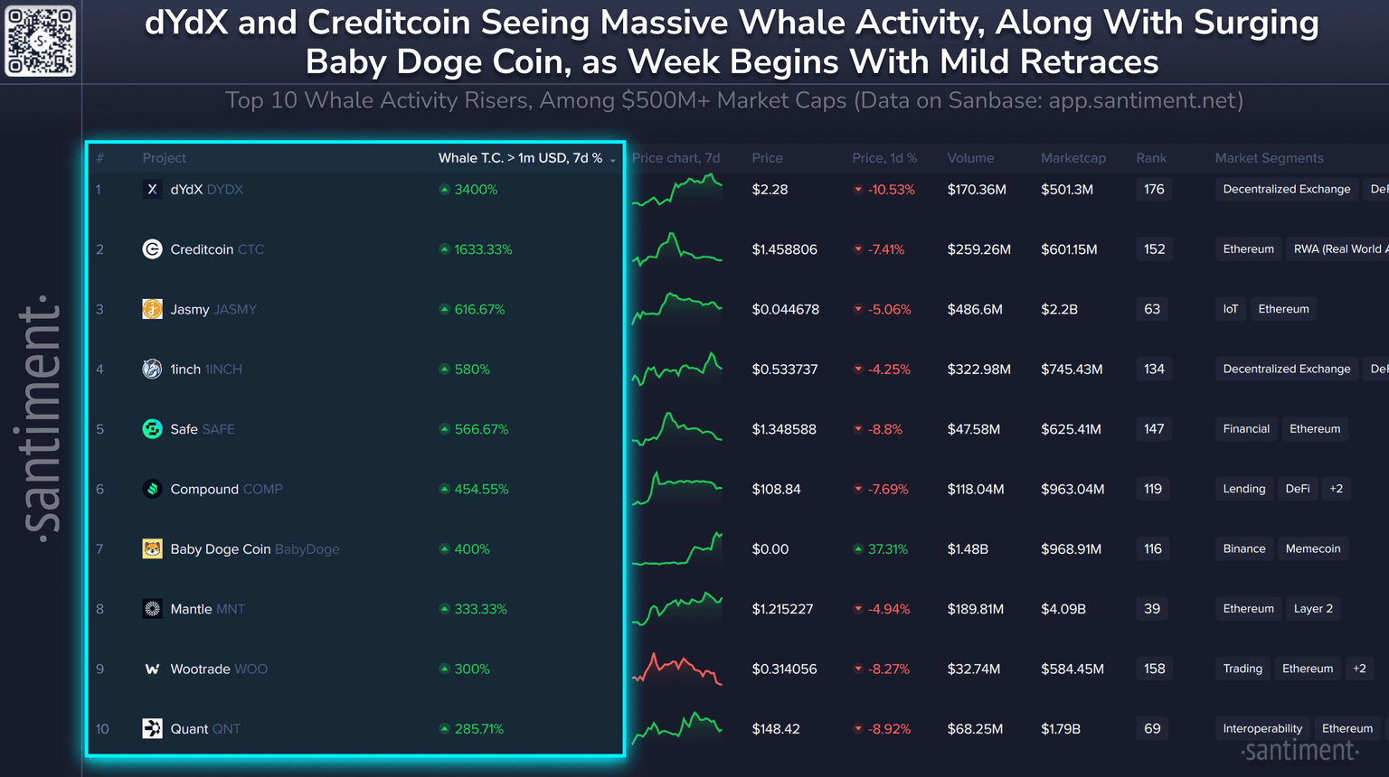 π³ Crypto market caps have opened the week down, but whales are still extremely active. Among $500M+ market caps, these are the assets seeing the highest rises