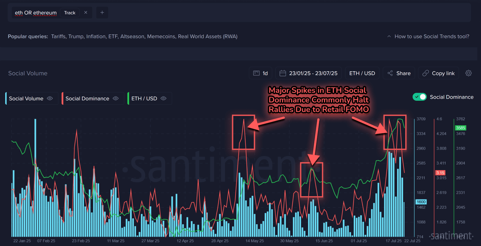 Santiment’s data also shows Ethereum's share of overall crypto-related discussions—what’s known as “social dominance”—has recently spiked. While it’s a sign of growing interest, these social dominance spikes often happen right as price momentum is peaking.