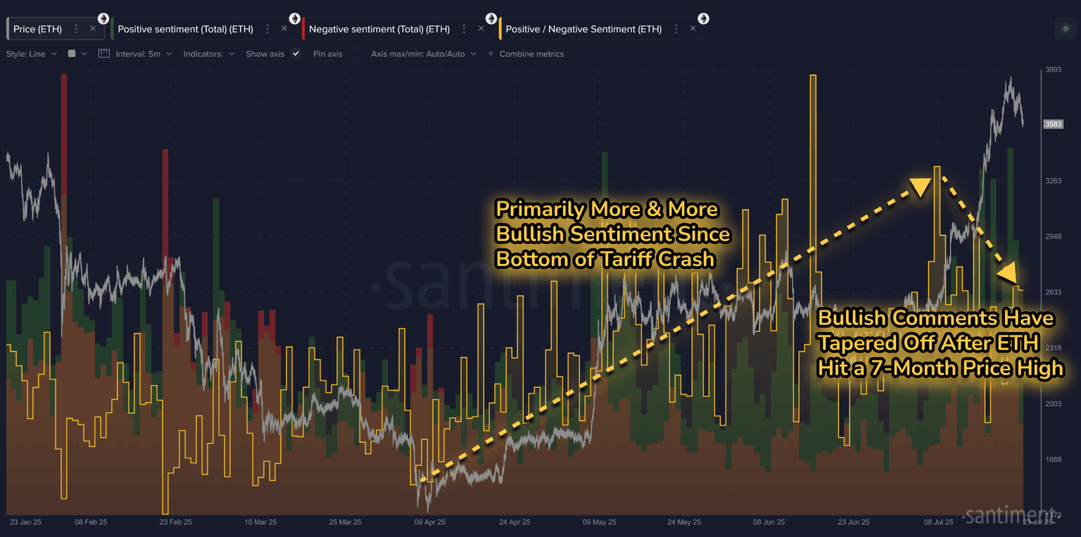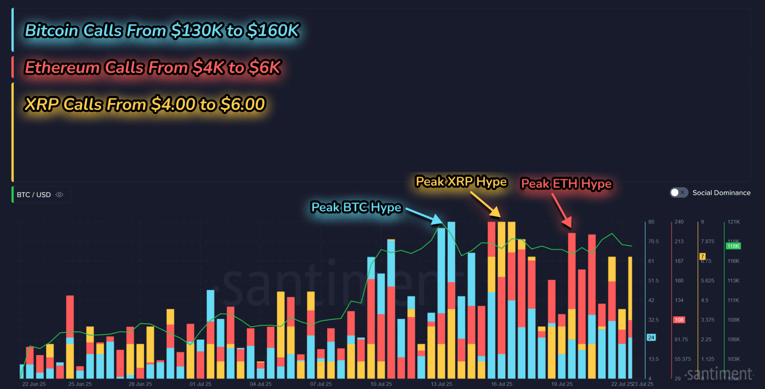 Over the past couple of weeks, Ethereum wasn’t alone in the spotlight. Social media chatter around price targets surged not just for ETH near the 4.00 and Bitcoin above $130K. According to Santiment’s data, each of the three largest non-stablecoin assets had its moment of peak social hype over the past two weeks. Consider this chart a FOMO finder for each asset, as the bar sizes make up the amount of discussions that are still well above the coins’ current market values, indicating hopeful optimism from the crowd.