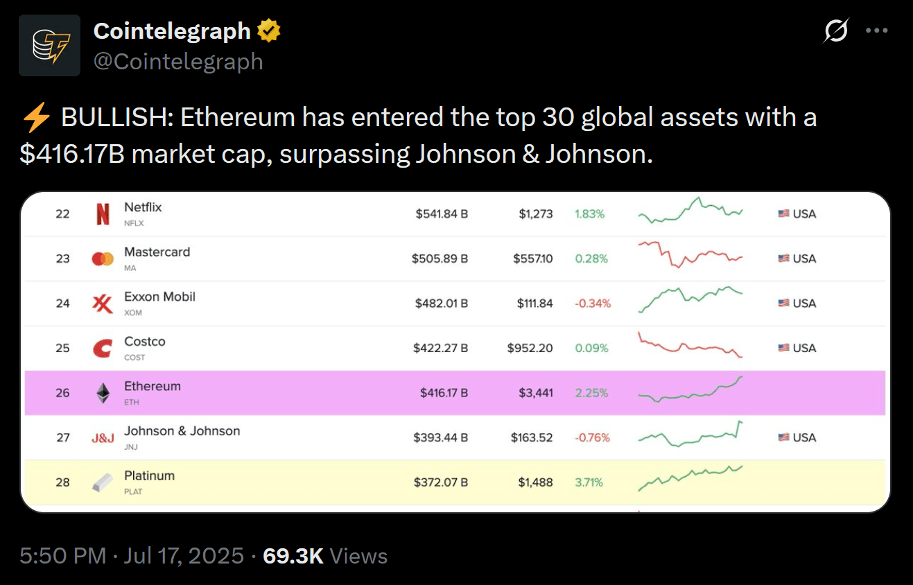 Meanwhile, Cointelegraph reports that Ethereum has climbed to the 26th spot on the global asset leaderboard, with a market cap of over $416 billion—surpassing Johnson & Johnson. News like this from outlets like Cointelegraph gives traders confidence that Ethereum is not only back in the race but climbing the ranks fast.