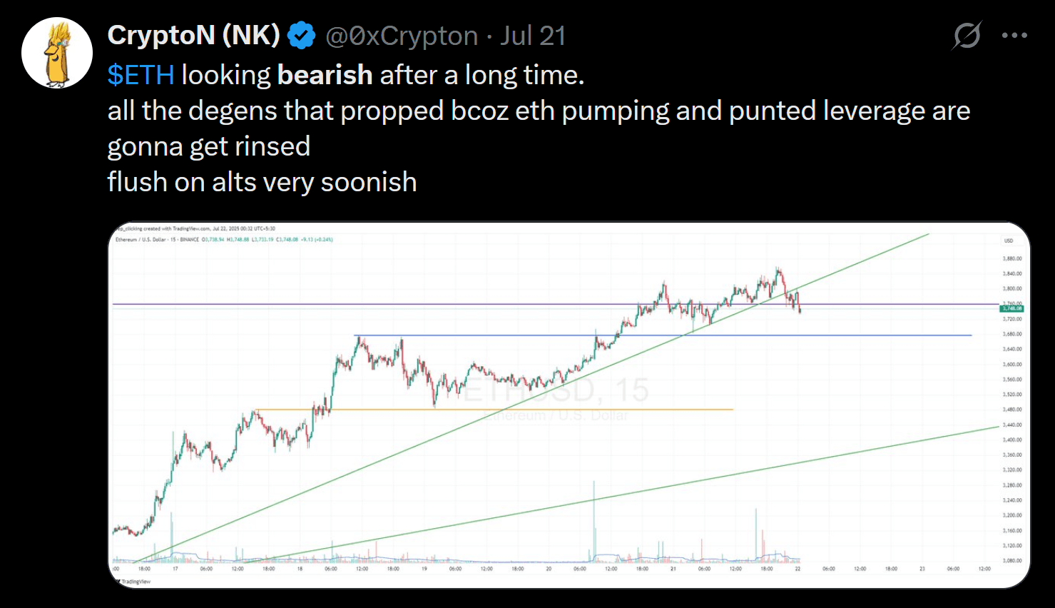 @0xCrypton on X warned that Ethereum looks “bearish after a long time," suggesting that overleveraged retail traders may soon face a flush if the price drops further. While the long-term trend is still intact, these warning signs are causing some traders to take profits or tighten their stop losses.