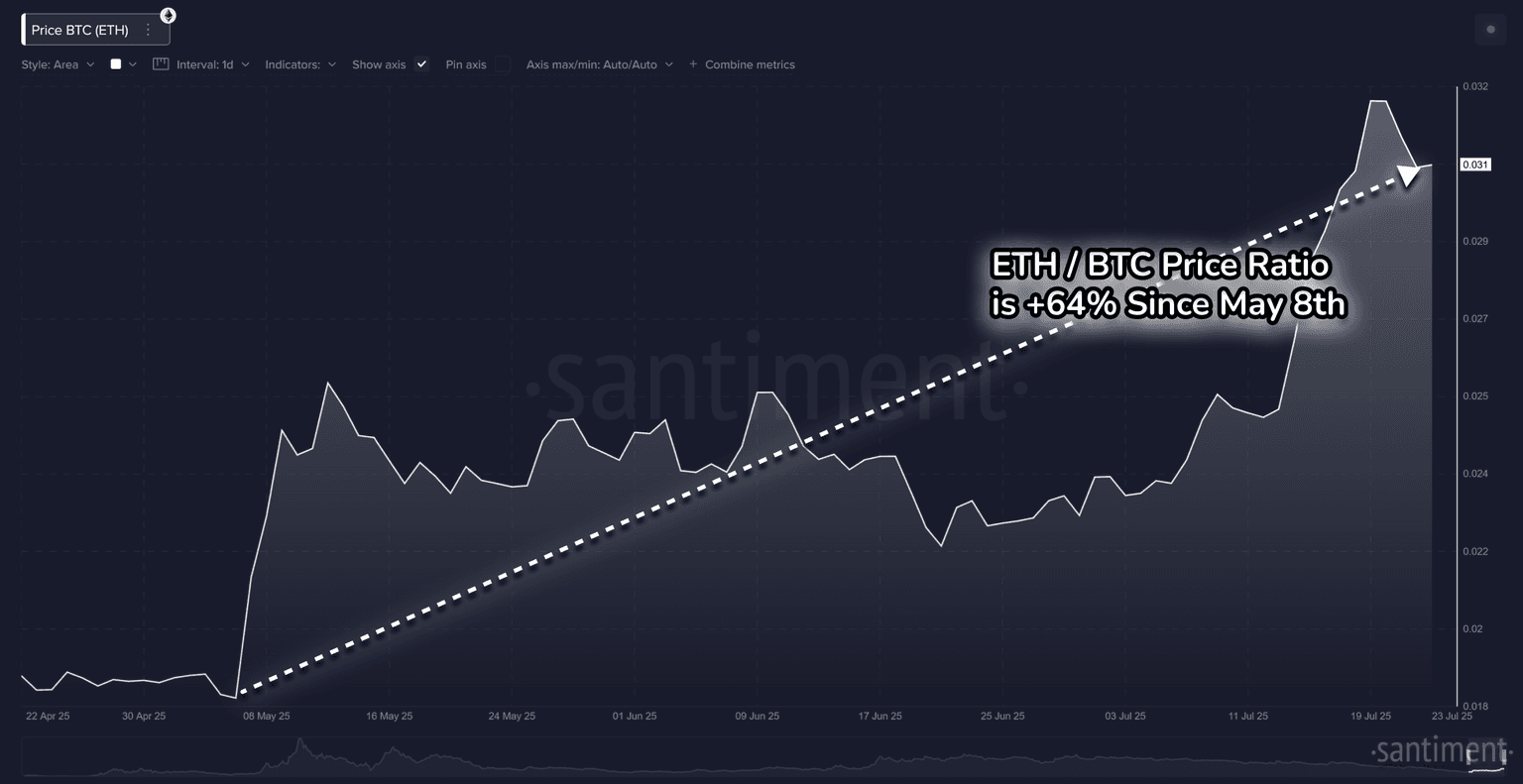 Ratio of Ethereum’s price vs. Bitcoin’s price, past 3 months. Source: Santiment