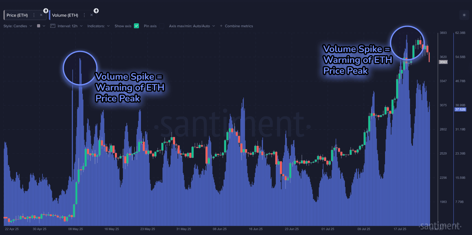 One of the more consistent signals in Ethereum’s history is that sudden spikes in trading volume tend to mark local price tops or at least temporary stalls in rallies. We saw this back in May and again in mid-July, where ETH volume surged alongside price before quickly cooling off. These moments often reflect a peak in retail excitement or “FOMO,” which can leave the market overextended and in need of a cooldown.