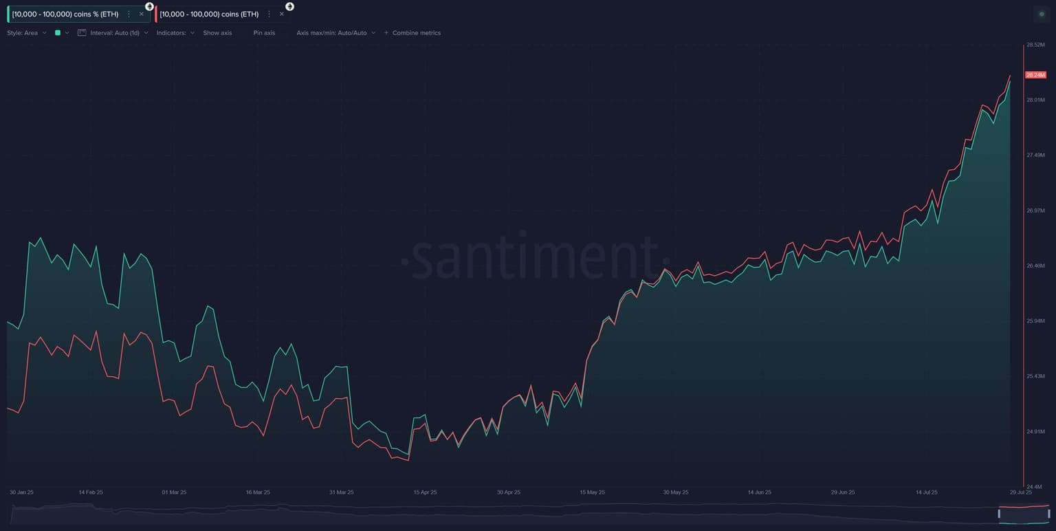 Wallets holding between 10K and 100K are one of the main tiers of Ethereum holders that dictate the asset's price movement. To no surprise, they have been aggressively accumulating as $ETH has surged these past 3 months. In 3 weeks, they have added 1.55M more collective coins.