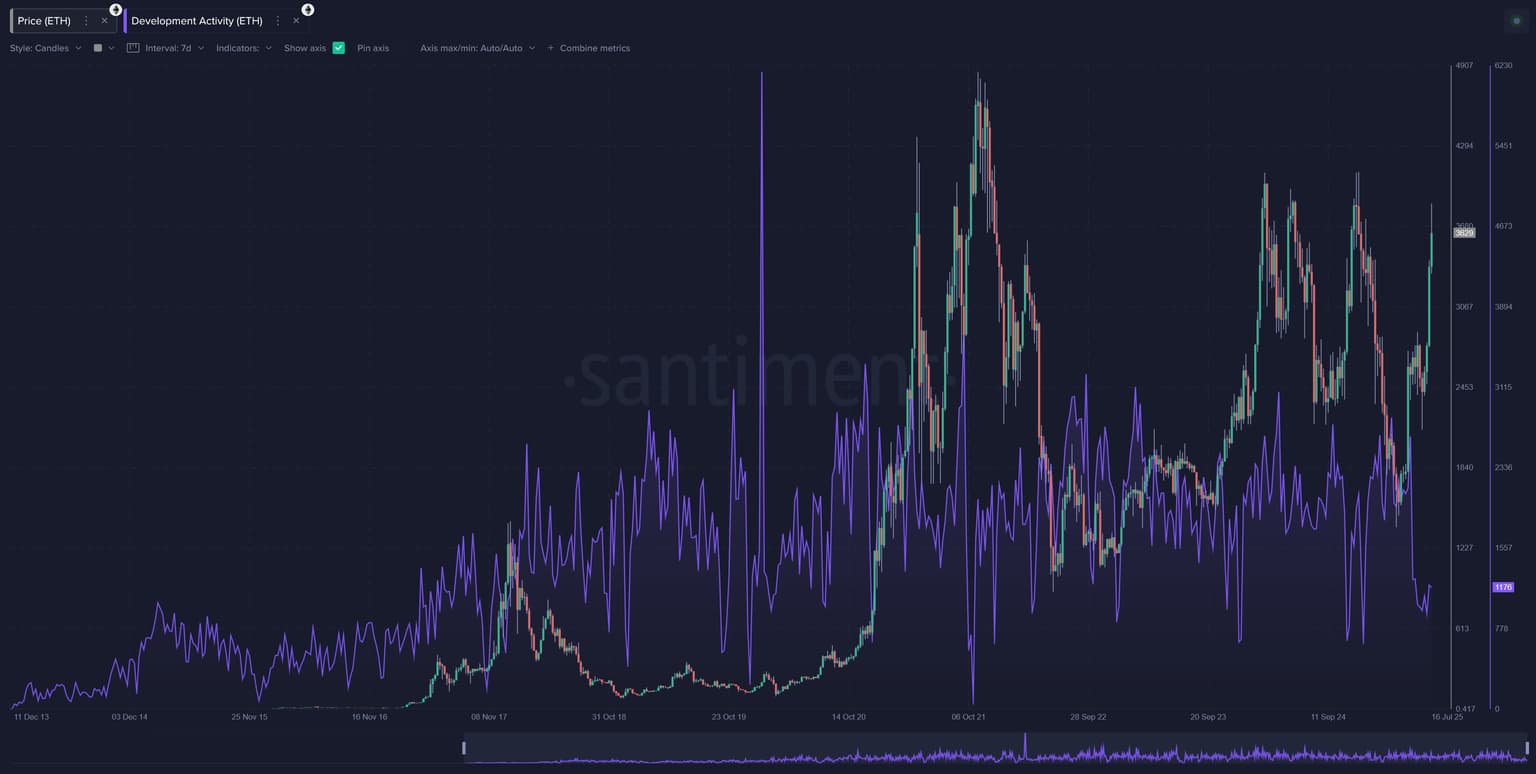Ethereum's development activity has also grown over time. As the asset has innovated and improved, its ecosystem has grown significantly. The developers produce over 157 notable github events per day, 10th among all assets.