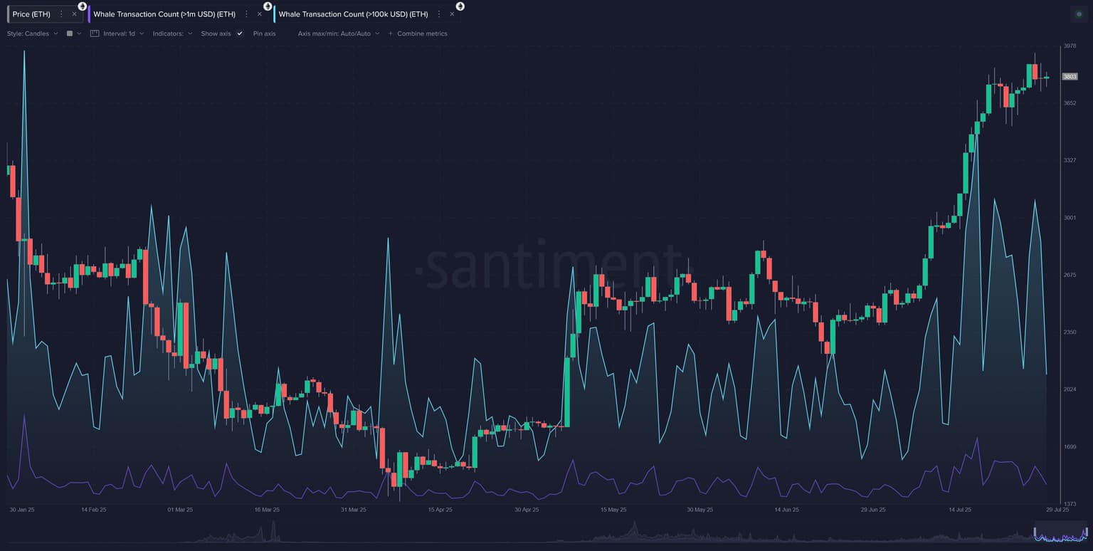 Whales have been significantly more active over the past couple of weeks compared to their normal activity past few years. By looking at transfers worth at least $100K, we see 14,628 individual whale transactions occurred this past Sunday, the 4th highest day of 2025.