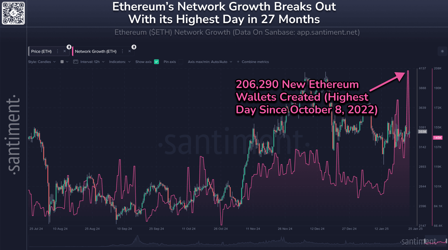 π Despite mild price concerns throughout crypto as the weekend came to an end, Ethereum's network blasted off with an astonishing 206,290 new addresses created between January 24th and 25th. This was the highest surge in network growth since October 8, 2022.