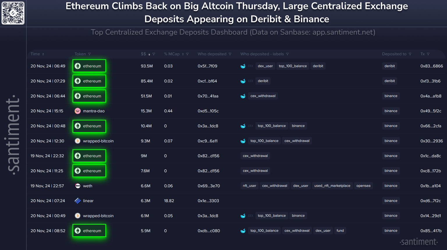 Ethereum Whale Deposits Litter the Top Centralized Exchange Dashboard on Altcoin Growth Day