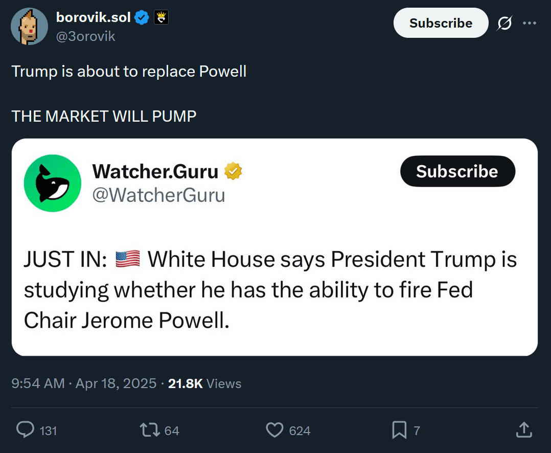 Regardless of the political and economic tensions, as we sit now, Polymarket (and its unbiased nature) tells a pretty jarring story. The crowd overwhelmingly thinks that no change will be made, for the time being. This is a reflection of the world's confidence in the US Fed to essentially take into account the long-term implications of changing rates, rather than reacting to short-term outcomes.