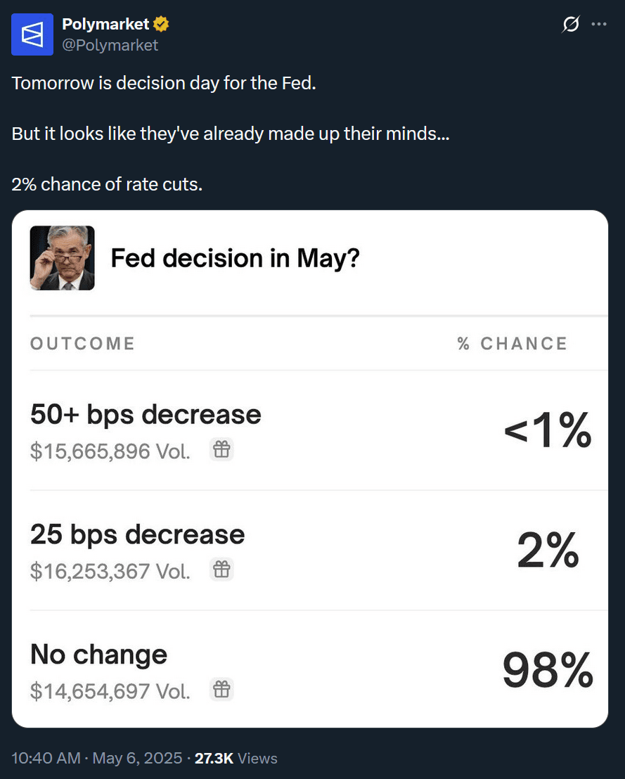 A major interest rate decision is set to be announced on Wednesday, May 7, at 2:00 p.m. ET, followed by what promises to be a widely watched press conference from Fed Chair Jerome Powell at 2:30 p.m. ET. Why is this such a big deal for the crypto world? Going into the decision, markets have been a mixed bag.