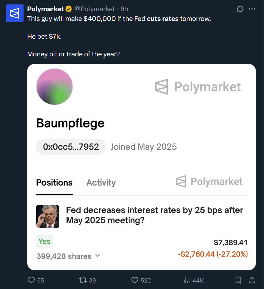 This uniform crowd belief isn't stopping several individuals from making bold bets to win big, due to the lopsided odds of tomorrow's result. For example, Polymarket's "Baumpflege" has bet 400,000 if the Fed cuts rates 25bps tomorrow: