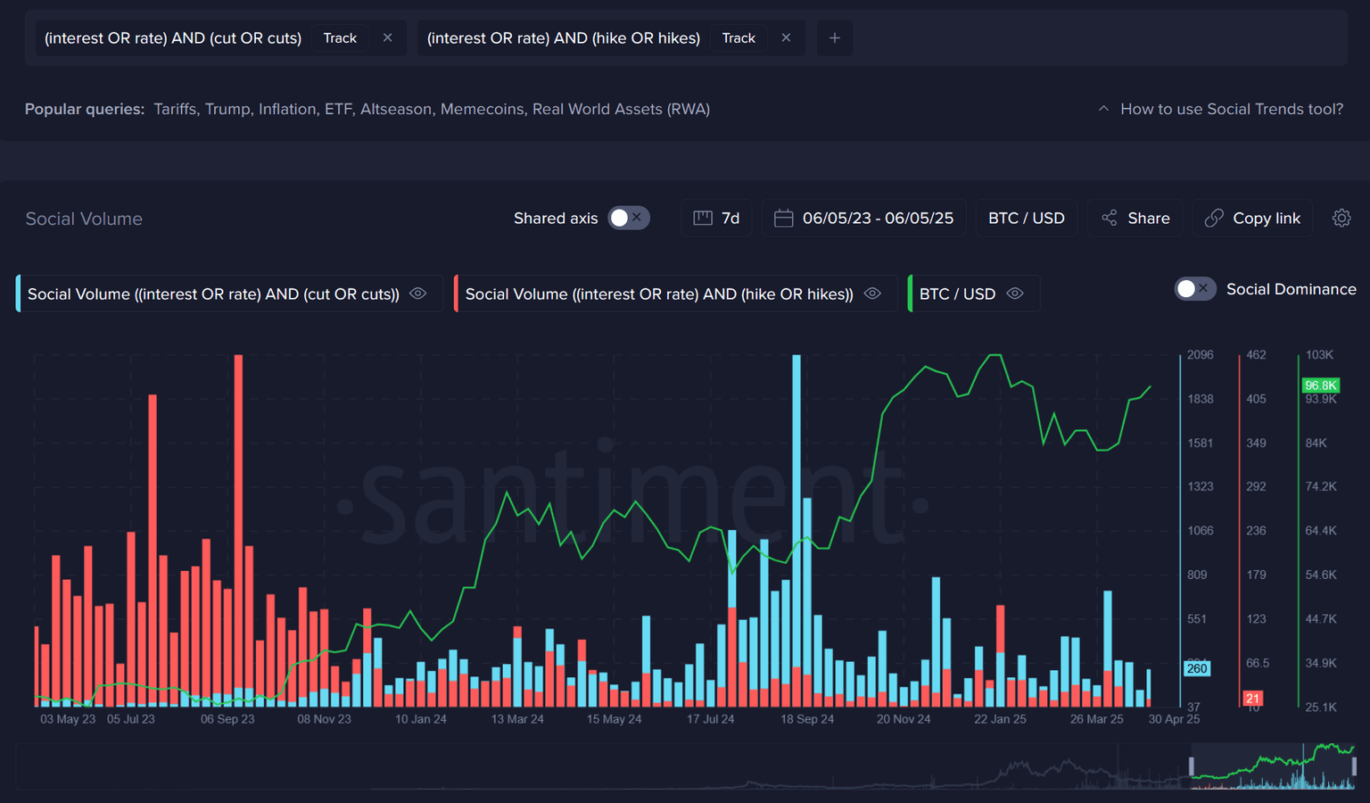Also, rate cuts can signal that the economy is facing challenges, like slowing growth or low consumer spending. In these times, some investors turn to crypto as a hedge against problems in the traditional financial system. Bitcoin, in particular, is sometimes called "digital gold" because people hope it will hold value during inflation or economic uncertainty. So, when the Fed lowers interest rates to try and boost the economy, it can also boost excitement and demand in the crypto world, making it a big deal for traders and long-term holders alike. Here is a comparison of social volume for rate hikes for rate cuts across social media over the past couple years:
