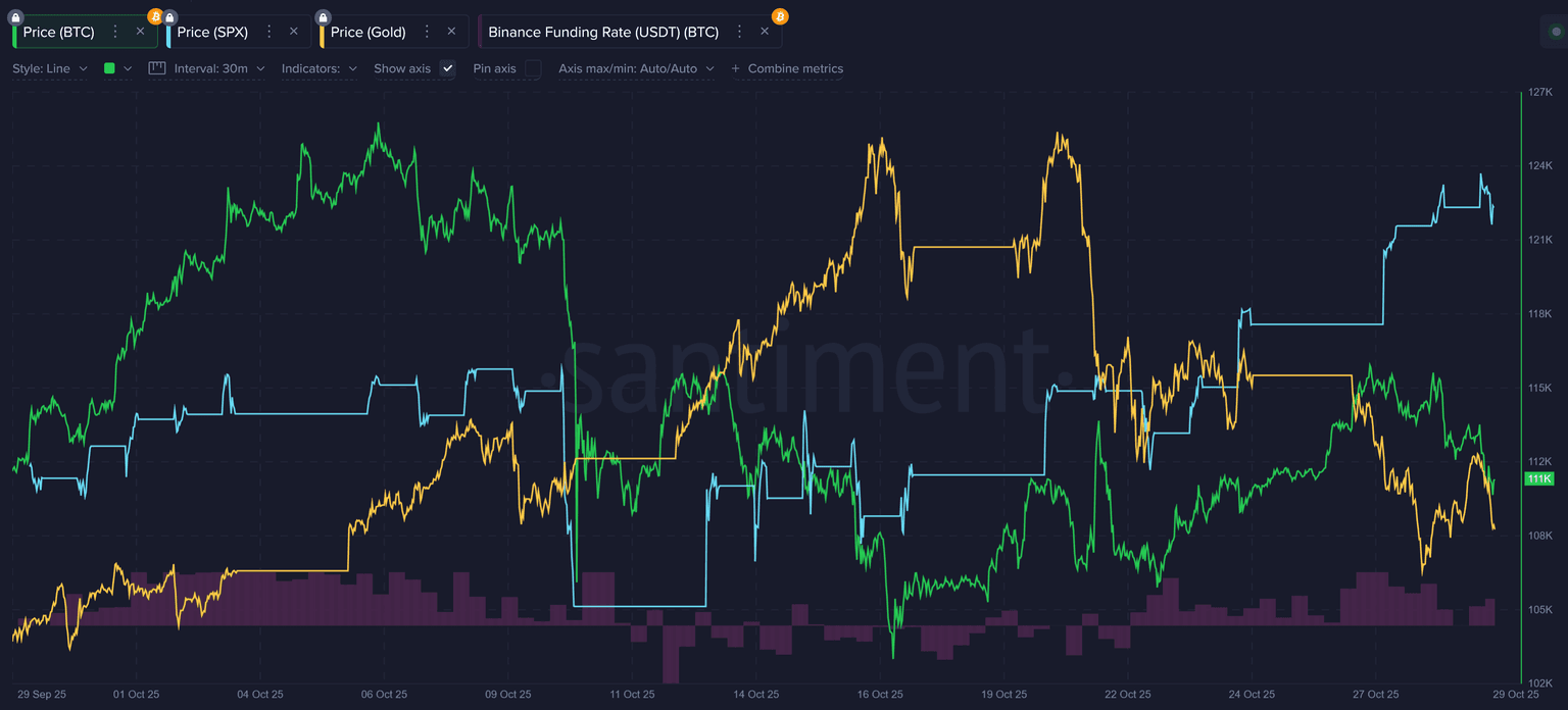 Stocks reacted the same way. The day started with modest gains, but as Powell’s words sank in, prices turned lower. The 10-year Treasury yield moved higher, and the U.S. dollar gained strength. When the dollar rises and bond yields go up, it often puts pressure on assets like crypto and tech stocks that depend on optimism and liquidity. The sudden change in market mood showed that investors were not just reacting to the cut itself but to Powell’s tone about what comes next. What's interesting is that Bitcoin's price movements are more in line with gold than the S&P 500 for now. But this pattern is usually temporary. So in the next 16 hours or so, we will likely either see: