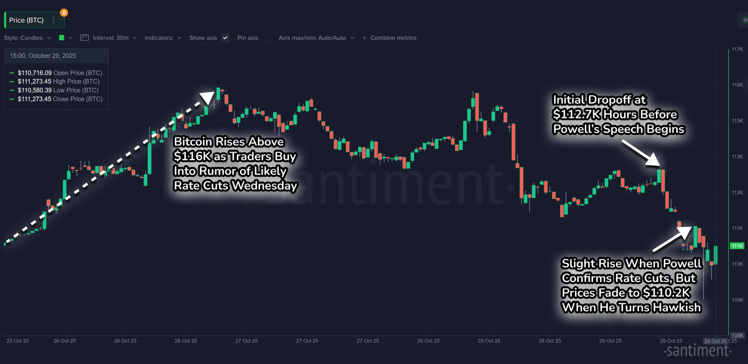 For crypto traders, US interest rates have factored in heavily. Particularly since interest rates rose in 2022, we've consistently seen a major connection between crypto and equity prices. Lower interest rates usually make riskier investments like Bitcoin more attractive because borrowing is cheaper and there’s more money flowing through the system. But when Powell suggests the Fed might slow down rate cuts, it cools that excitement. After his comments, Bitcoin fell about 5% within a day, dropping below $110,000. What should have been good news—a rate cut—ended up turning negative because investors were expecting the Fed to go further.