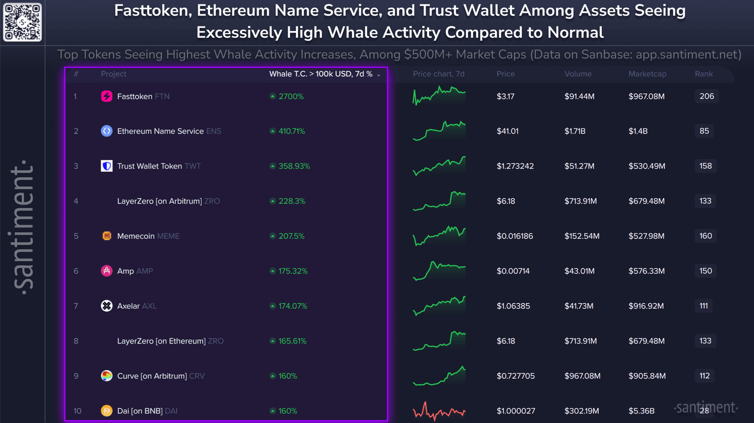 π Altcoins continue to fly. Here are the 10 most notable coins (with at least a $500M market cap) seeing the highest rise in whale transactions this week: