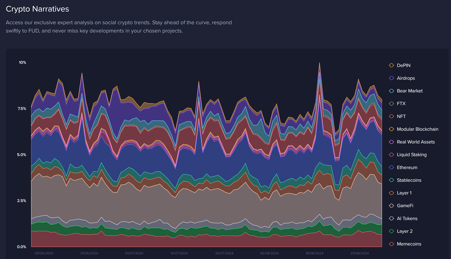 Specifically, we will be focusing on the subjects that have been making up the Alpha Narratives page in recent weeks, as the clever AI-generated captures of real crypto topics provide valuable nuggets of information pertaining to how bullish or bearish the crowd is getting at any moment, and what's in store for future price action.