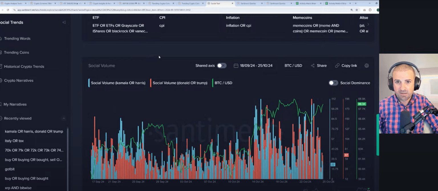 Brian highlighted the influence of social sentiment on market movements, noting that spikes in mentions of political candidates often coincide with market rallies. Trump, in particular, tends to dominate social media discussions, which could impact crypto prices as the election nears. The Santiment social trends tool reveals that Trump's mentions frequently surpass those of his opponent, Kamala Harris, suggesting a correlation between his media presence and market activity.