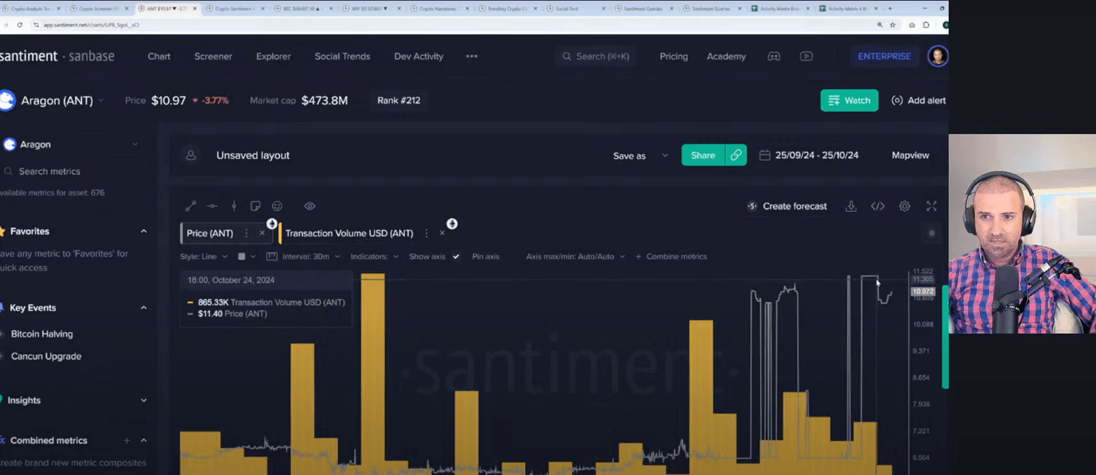 Brian explored the Network Activity Matrix to identify altcoins with significant network activity. Aragon (ANT) emerged as a standout, showing a massive spike in activity and price fluctuations. This spike indicates a surge in transactions and interactions within the Aragon ecosystem. Over the past month, ANT has experienced significant price volatility. High activity suggests that there may be increased interest in Aragon, possibly driven by recent updates or community initiatives. Additionally, whale transactions have shown notable spikes, indicating that larger investors are actively engaging with ANT. This level of activity often precedes major price movements, making ANT a focal point for traders looking to leverage short-term market dynamics.